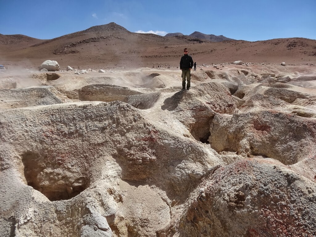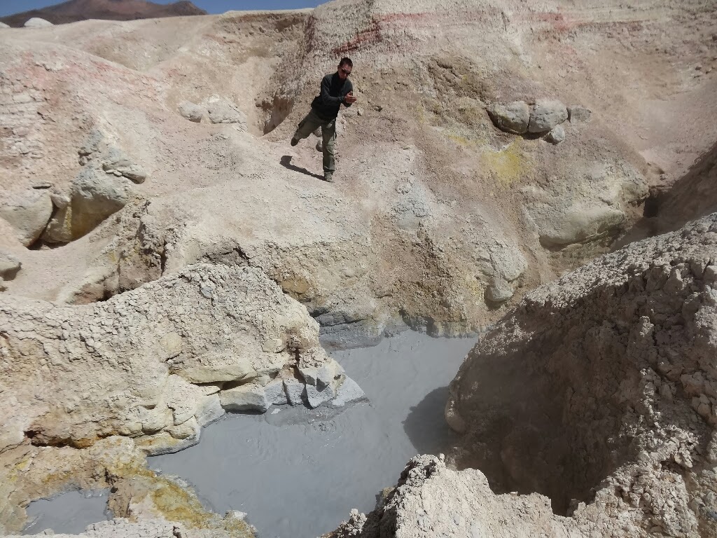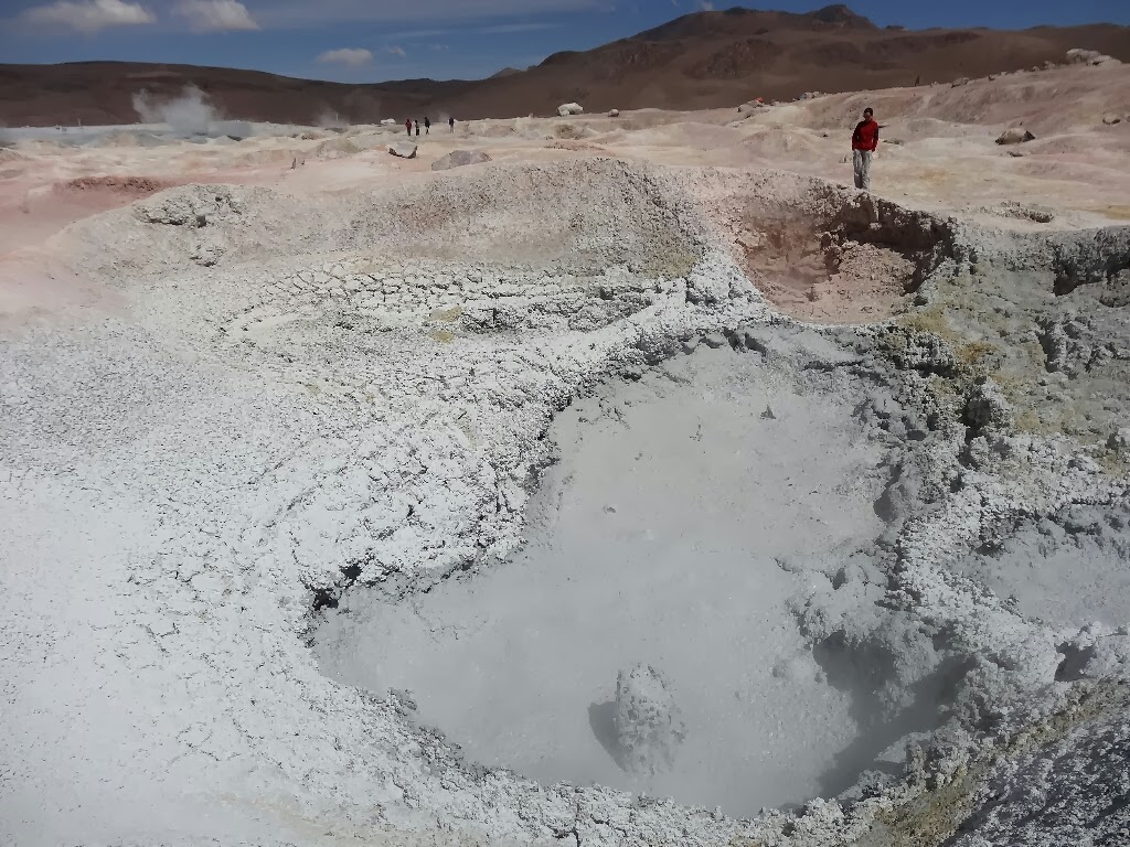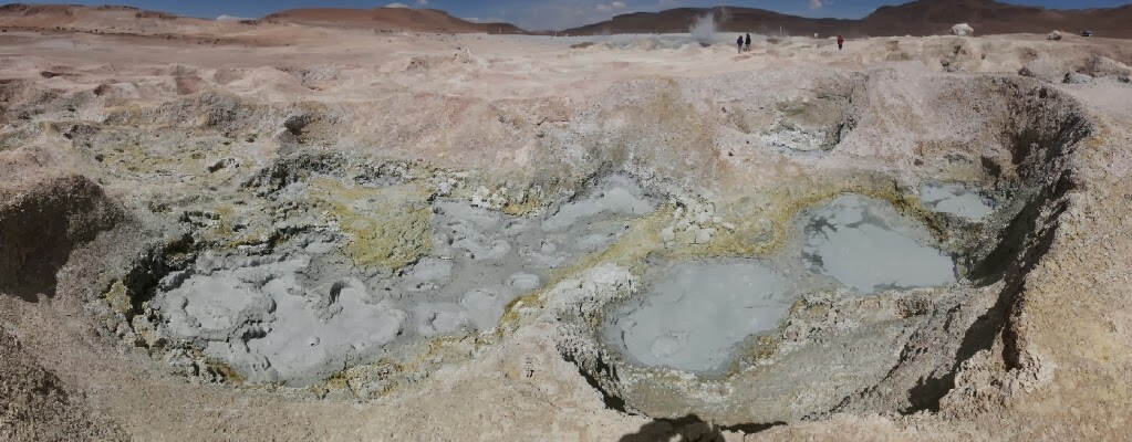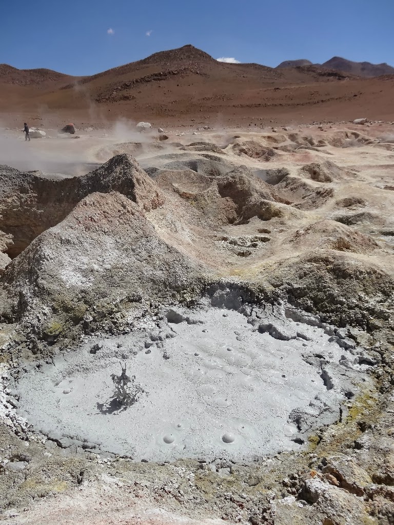 Dans l'après-midi, on s'arrête d'abord aux geysers Sol de Mañana. Nous sommes à 5000m d'altitude. Cela porte le nom de geysers mais c'est plutôt des cratères de boue bouillonnante et des fumerolles. La température peut atteindre 200°C. La boue est de couleurs variables : grise mais aussi marron, rouge, orange ou jaune, tantôt fluide, tantôt visceuse. C'est un endroit très particulier et spectaculaire.