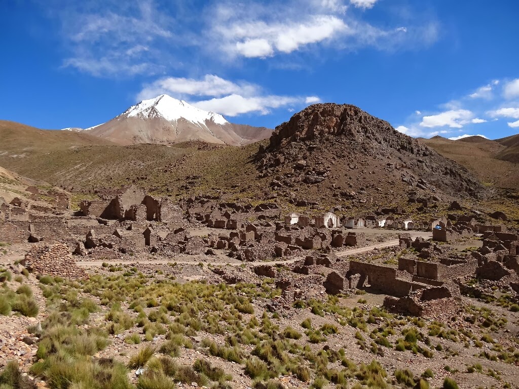 Nous atteignons les ruines d'un village abandonné. A 4690m d'altitude, les espagnols sont venus ici exploité l'or et l'argent puis sont partis. Le village a compté jusqu'à 1500 habitants. Des boliviens sont revenus mais l'endroit est semble t-il maudit, beaucoup de gens sont morts mystérieusement en pleine nuit. Deux hypothèses circulent : le diable ou le monoxyde de carbone s'échappant de la mine, en tout cas ils sont tous partis. Il ne reste plus que des murs de pierres et de petits habitants un peu timides, des viscaches, un genre de lapin-kangourou. C'est un rongeur qui se déplace en sautillant comme un kangourou.