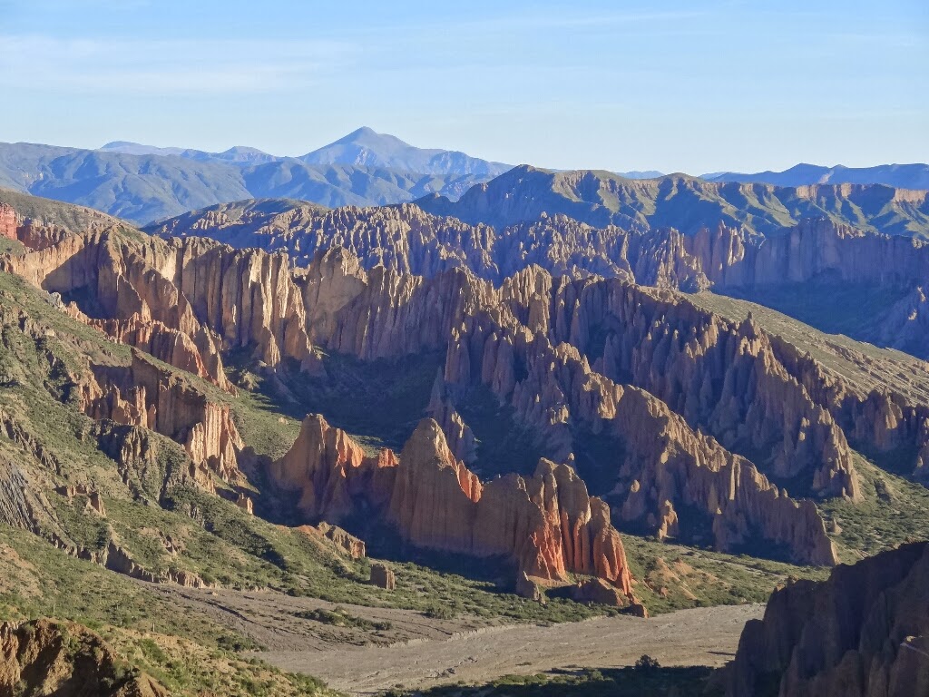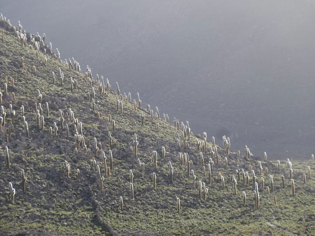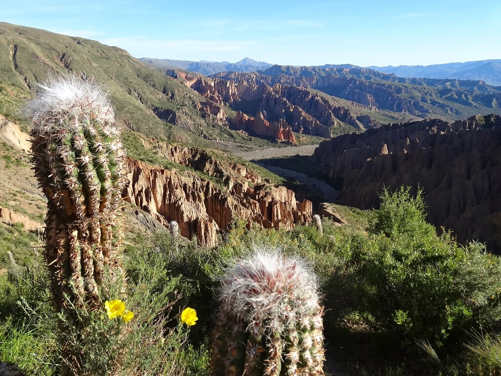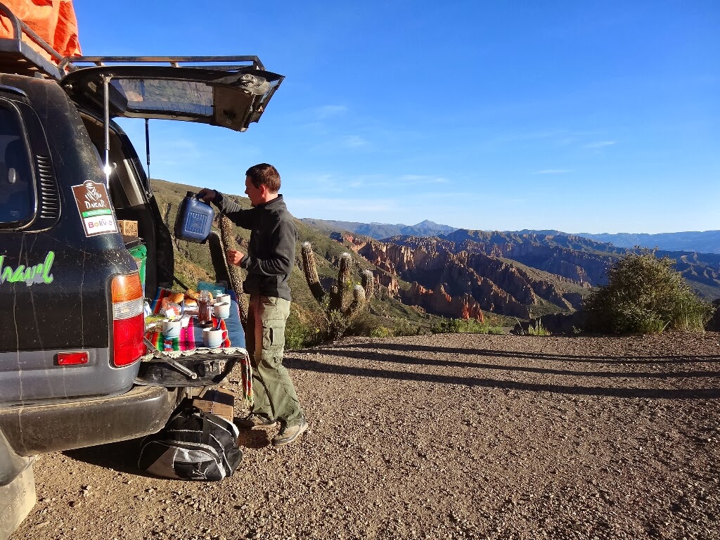 Nous partons de Tupiza, à six dans un bon 4x4 land cruiser : Fortunata notre cuisinière, Suzanne et Michaela deux autres touristes, nous deux, et notre guide Jésus. On commence à monter sur l'Altiplano et nous faisons une première halte pour prendre le petit déjeuner dans un cadre magnifique alors que le soleil se lève et éclaire petit à petit les flans des vallées autour de nous.