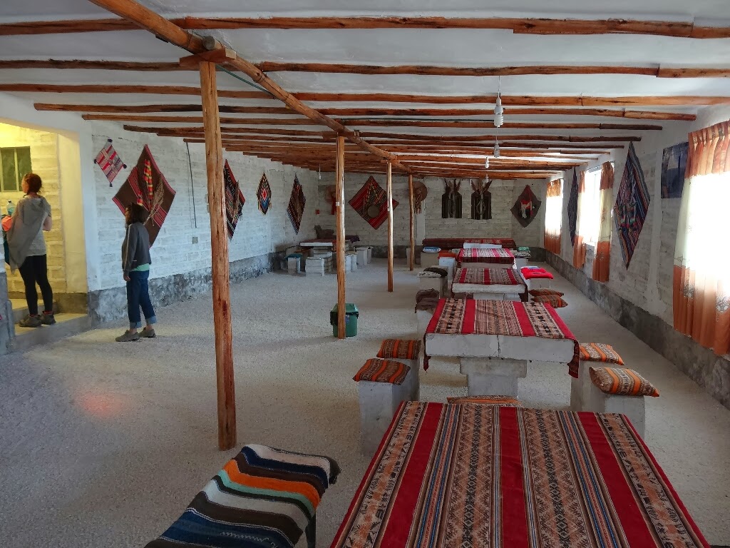Notre hôtel est en fait un hôtel de sel : les murs sont construits en briques de sel, ça n'a rien d'un habitat traditionnel, c'est pour accueillir les touristes. Après le bar de glace en Patagonie, l'hôtel de sel en Bolivie.