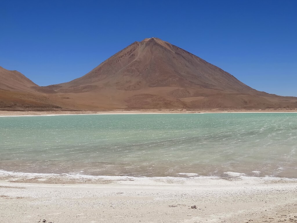 En chemin nous passons le désert de Dali et roulons entre les volcans pour atteindre la laguna verde au pied du Licancabur, la pointe sud-est de la Bolivie, derrière c'est le Chili et le désert d'Atacama.