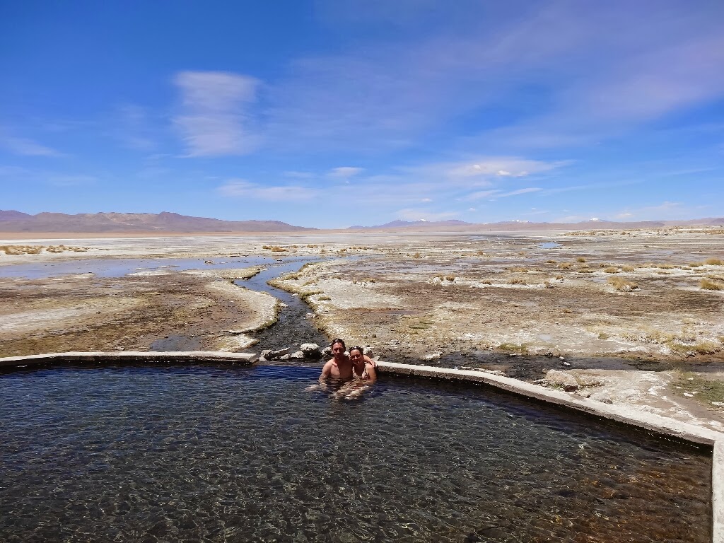 Nous revenons sur nos pas et avant la pause déjeuner nous avons droit à un petit bain chaud face à la lagune et aux volcans dans un terme naturel (c'est quand même chouette les régions volcaniques...).