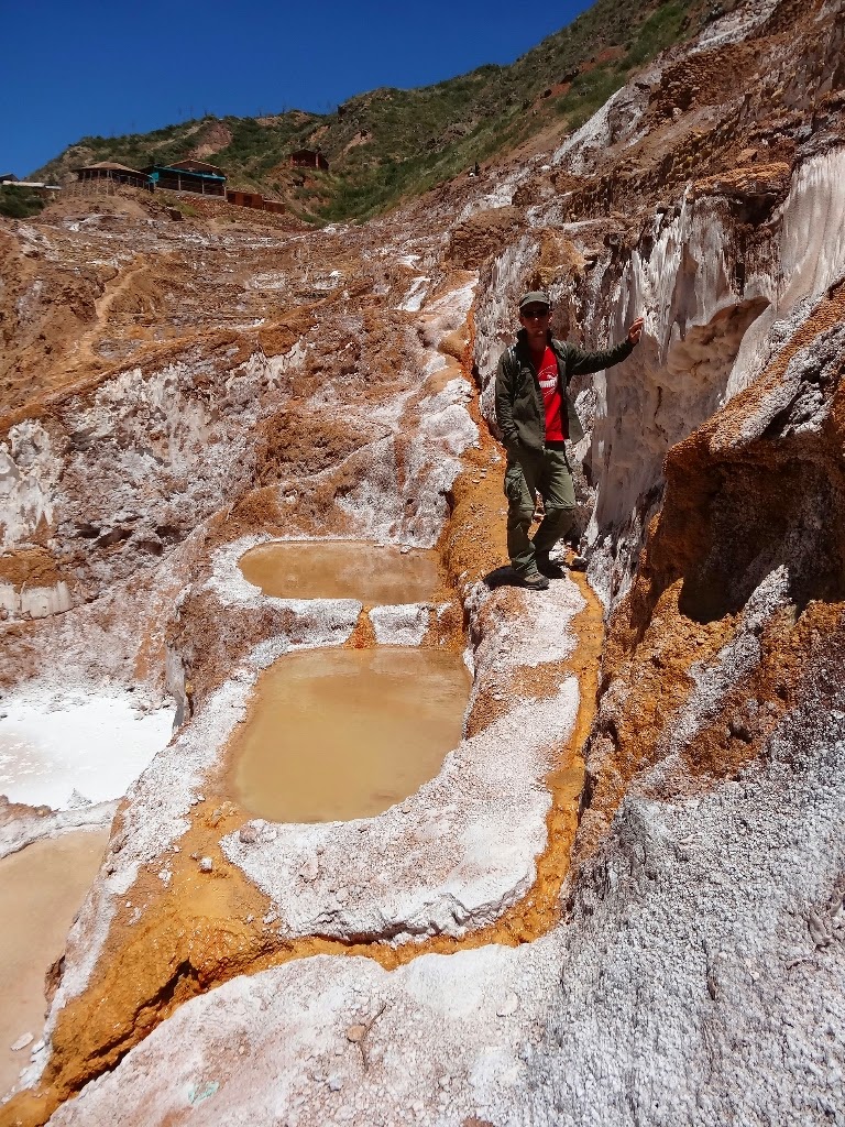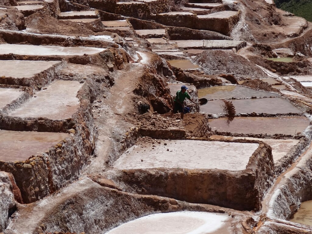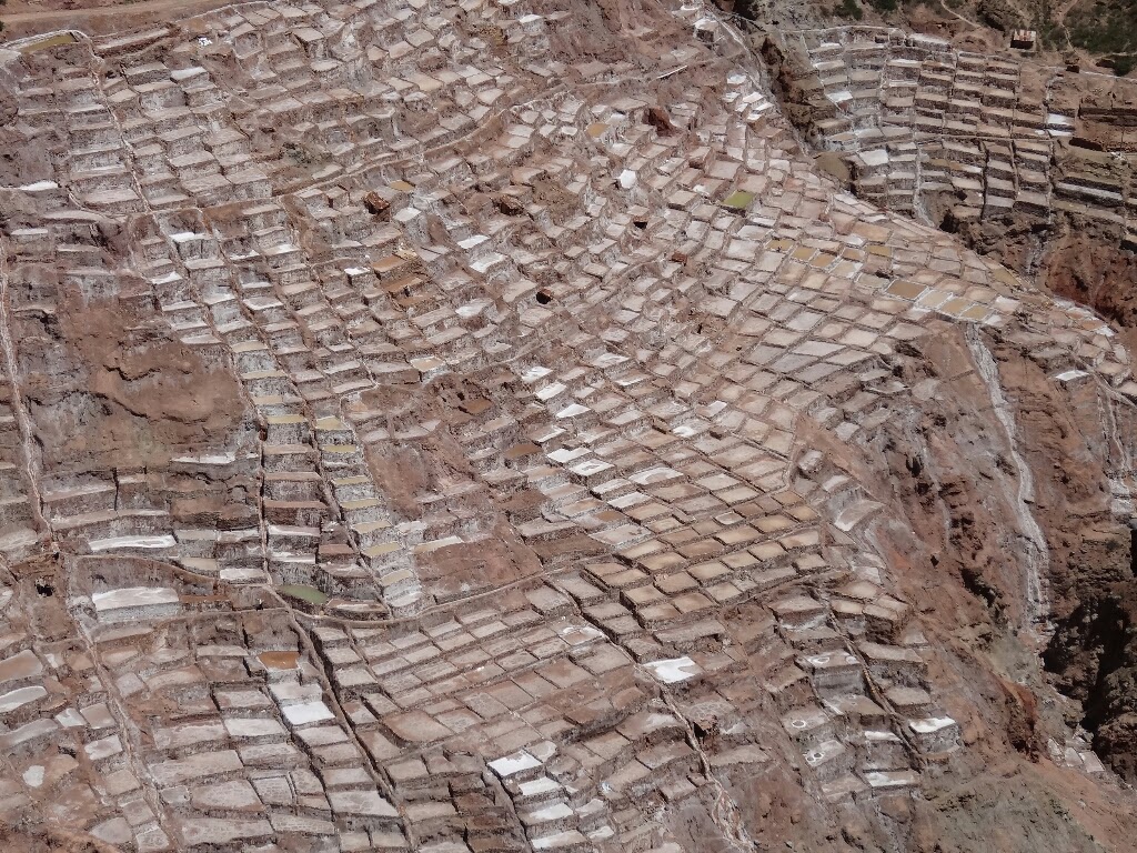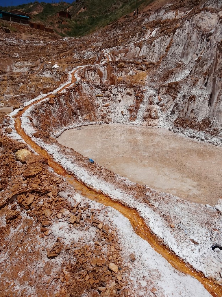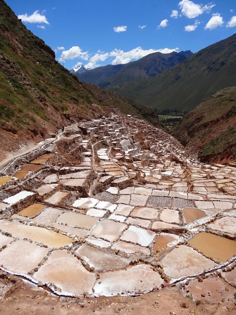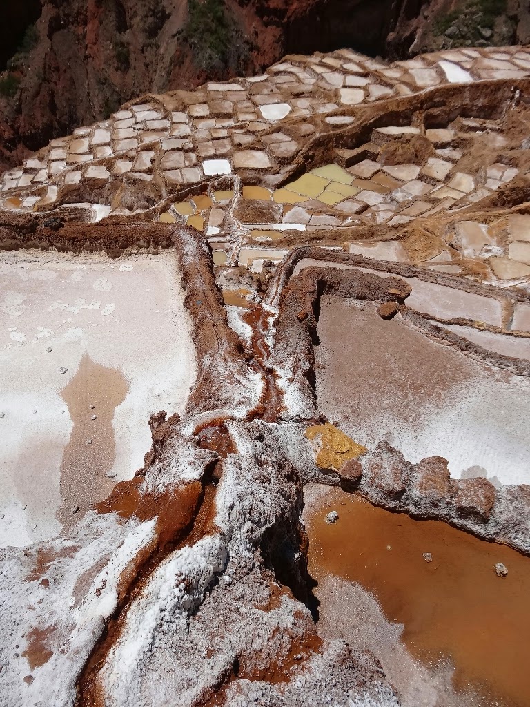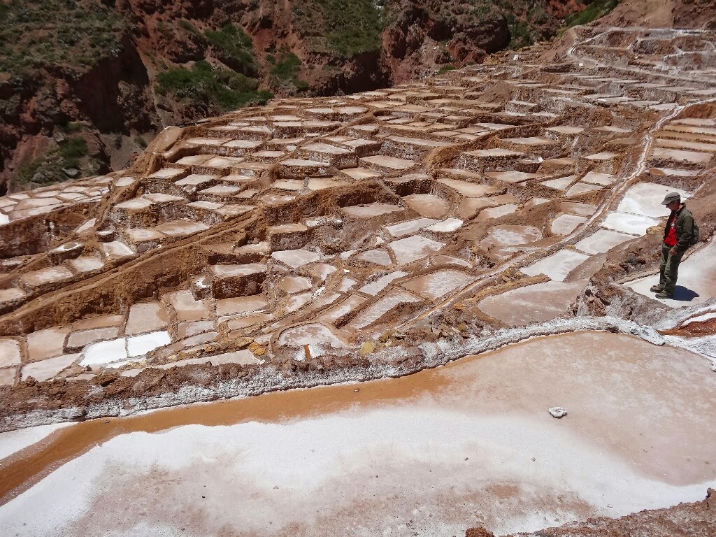 Les salines, comme leur nom l'indique, sont une exploitation de sel, déjà en activité du temps inca. Elles se trouvent dans une petite vallée encaissée d'où jaillit une source salée. Détournée, elle alimente de petits bassins construits sur le flanc de la vallée qui ont pour rôle d'évaporer l'eau et de précipiter le sel. En ce moment, comme c'est la période des pluies, les salines ne sont pas en activité, elles le seront à partir du mois d'avril. Il y a donc peu de travailleurs, les seules personnes que l'on croise entretiennent des terrasses.