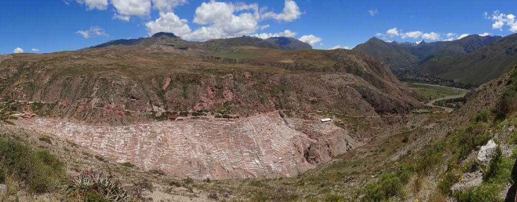 Les salines, comme leur nom l'indique, sont une exploitation de sel, déjà en activité du temps inca. Elles se trouvent dans une petite vallée encaissée d'où jaillit une source salée. Détournée, elle alimente de petits bassins construits sur le flanc de la vallée qui ont pour rôle d'évaporer l'eau et de précipiter le sel. En ce moment, comme c'est la période des pluies, les salines ne sont pas en activité, elles le seront à partir du mois d'avril. Il y a donc peu de travailleurs, les seules personnes que l'on croise entretiennent des terrasses.