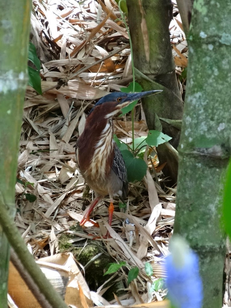 Plus loin, il nous montre un autre trou mais vide cette fois-ci, la femelle vient d'en partir, le mâle devrait bientôt revenir. Alors qu'il est presque l'heure que nous rentrions pour le petit-déjeuner, le quetzal fait enfin son apparition. Il se pose sur une branche non loin de son nid puis vient se poser à l'entrée du nid. Quelques dizaines de seconde après il rentre à l'intérieur ne laissant dépasser que ses deux grandes plumes un peu encombrantes.