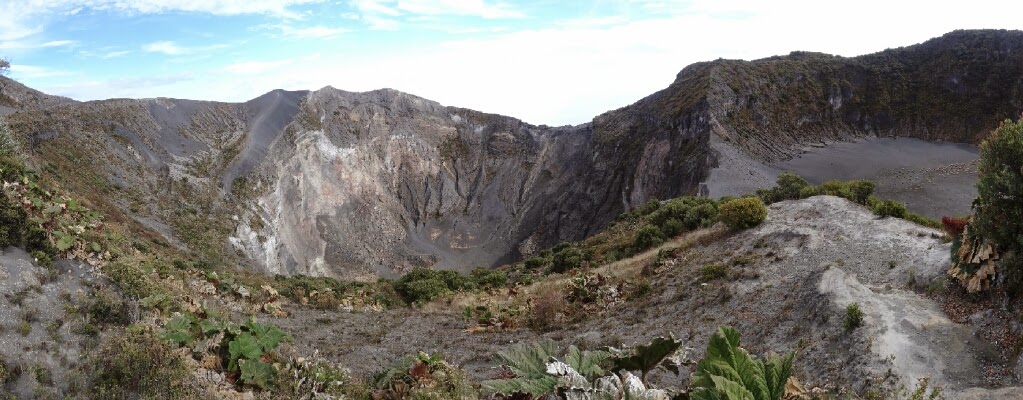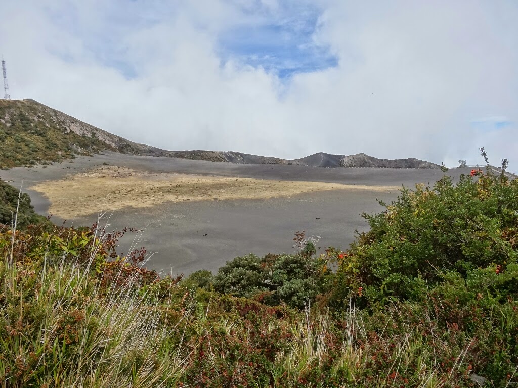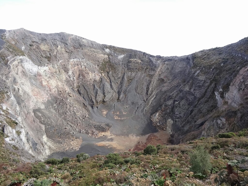 Le lendemain matin à 7h nous affrétons un taxi pour aller au volcan Irazu. C'est un des volcans actifs du Costa-Rica. Au sommet se trouvent trois cratères : le fond de l'ancienne caldeira, un deuxième qui se revégétalise doucement et le troisième, dernier actif en date, dans lequel se trouve normalement un lac, mais actuellement il est asséché. Ce cratère mesure plus de 1000m de large et 300m de profondeur.