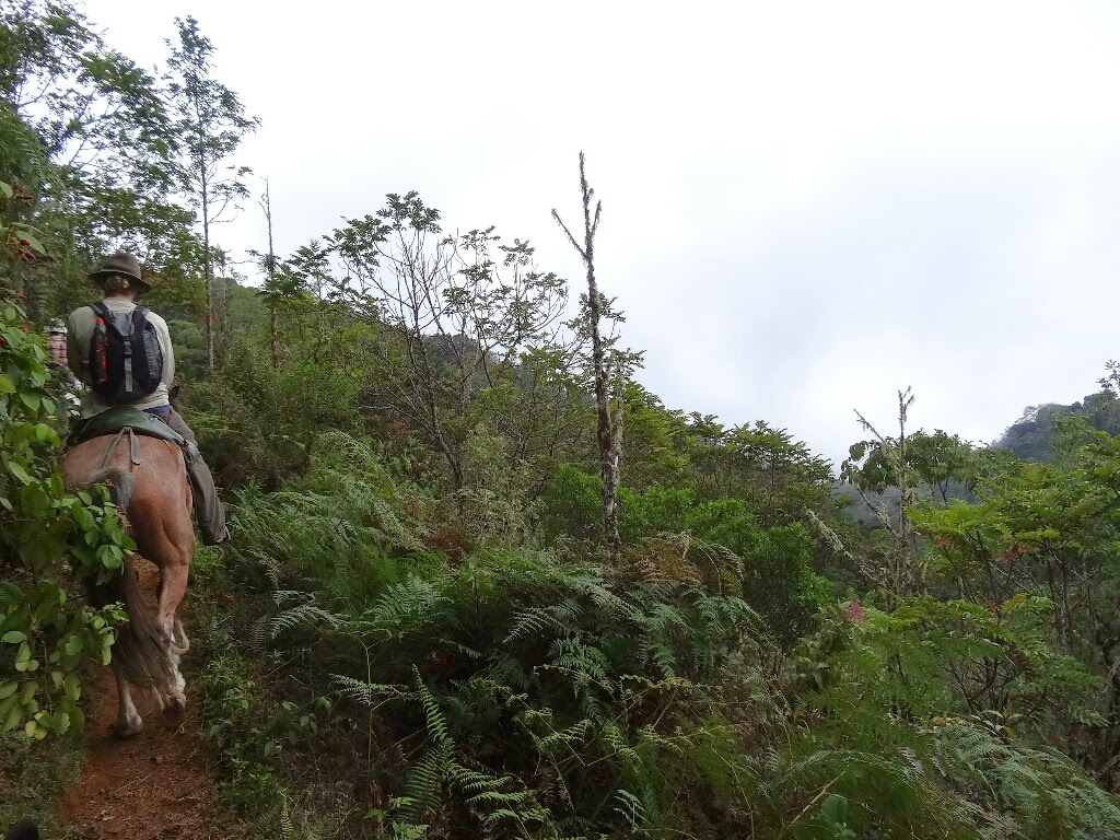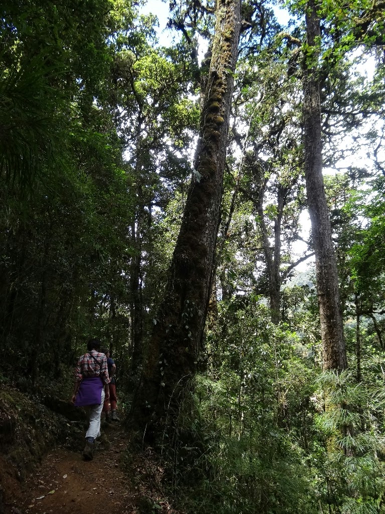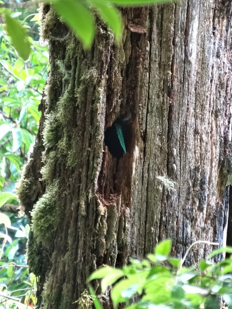 Le lendemain matin on se lève à l'aube pour aller en forêt et essayer de voir le quetzal, un oiseau emblématique de la région et qui avait un rôle symbolique dans les mythologies aztèques et mayas. En chemin nous croisons un canadien qui nous montre un trou dans un arbre mort duquel dépassent les longues plumes caudales du quetzal mâle. En ce moment c'est la période de nidification.