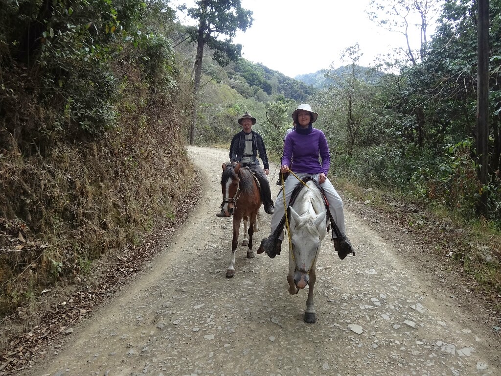 Le lendemain on part faire 3h de cheval. On suit d'abord la route de la vallée puis on emprunte un plus petit chemin jusqu'à une cascade. Avant de revenir le guide nous fait prendre un sentier qui monte dans la forêt, c'est vraiment plus sympa que la route. On galope sur ce petit sentier, ces petits chevaux sont très agiles.