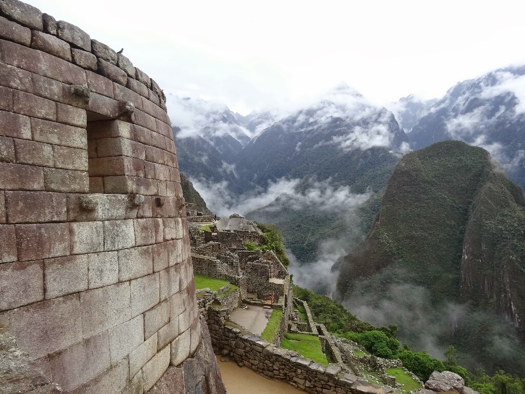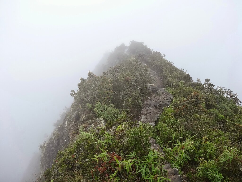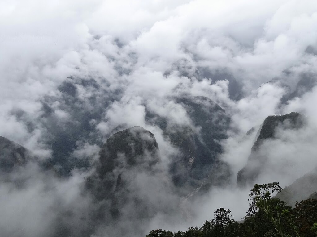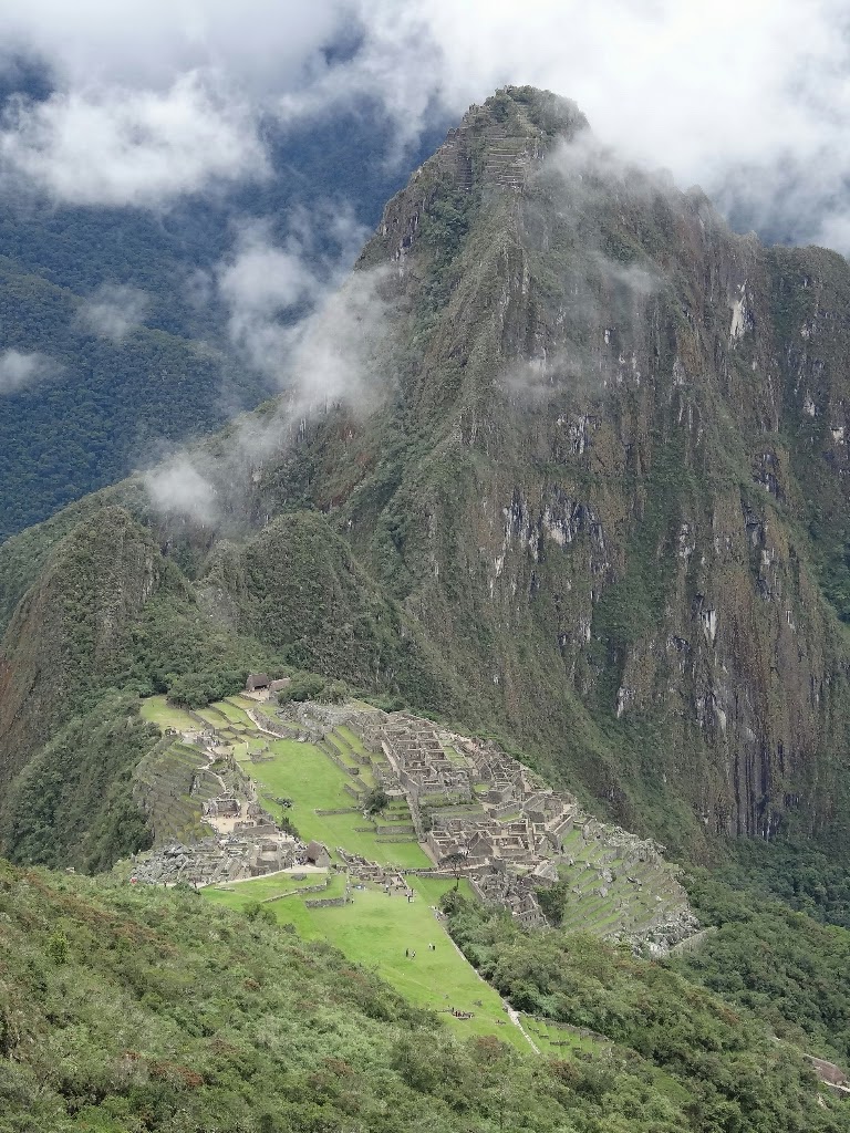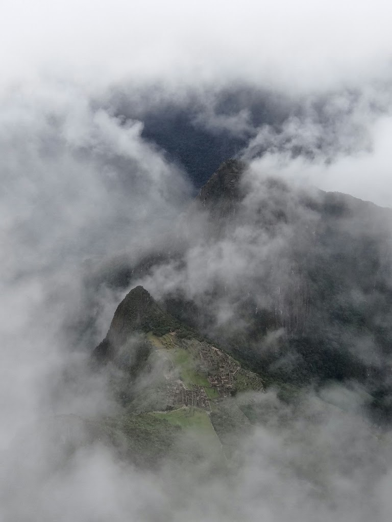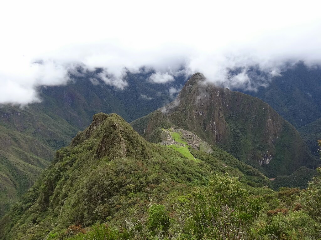 A notre arrivée au sommet à 3082m il y a beaucoup de nuages et le Machu Picchu n'apparait que par intermittence mais on a une vue incroyable du site depuis ce sommet. Dommage que le ciel ne soit pas plus dégagé on aurait eu une superbe vue sur les montagnes alentours.