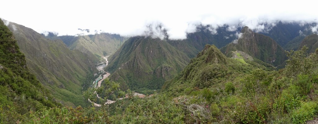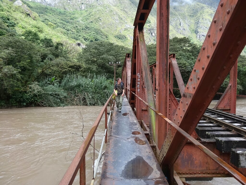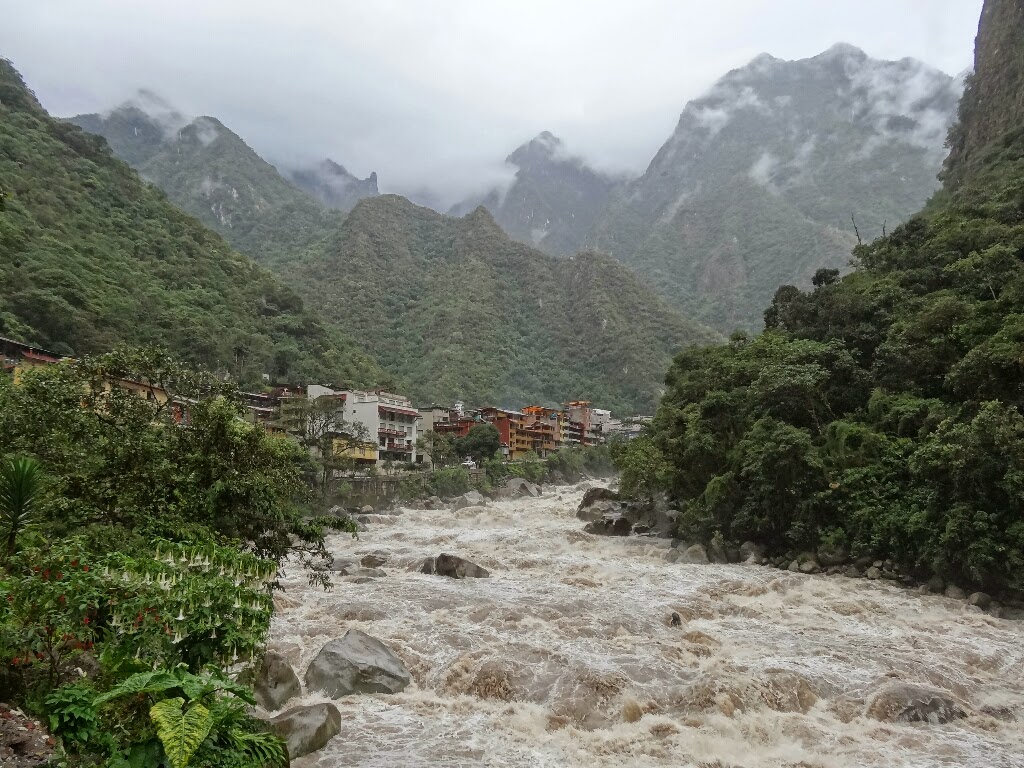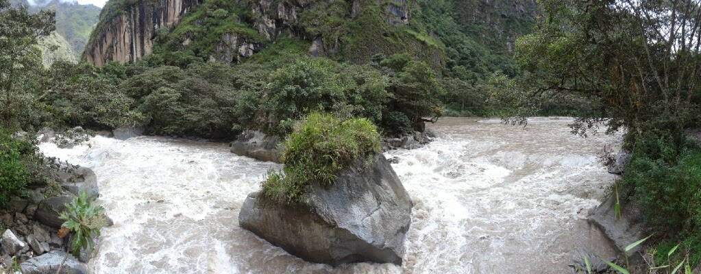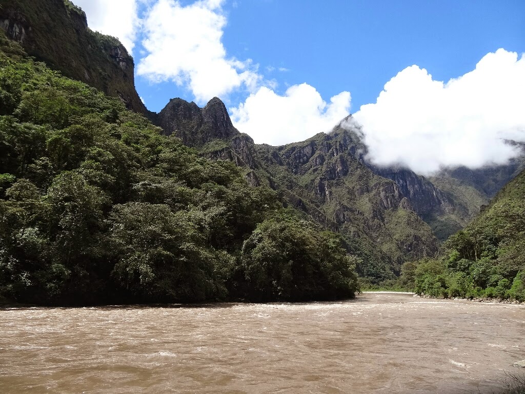 Cette balade est très jolie et sympathique, elle suit le rio Urubamba qui forme un méandre et des rapides impressionnants autour du massif sur lequel est perché la cité du Machu Picchu, on en aperçoit quelques terrasses et des morceaux de murs depuis la vallée.
