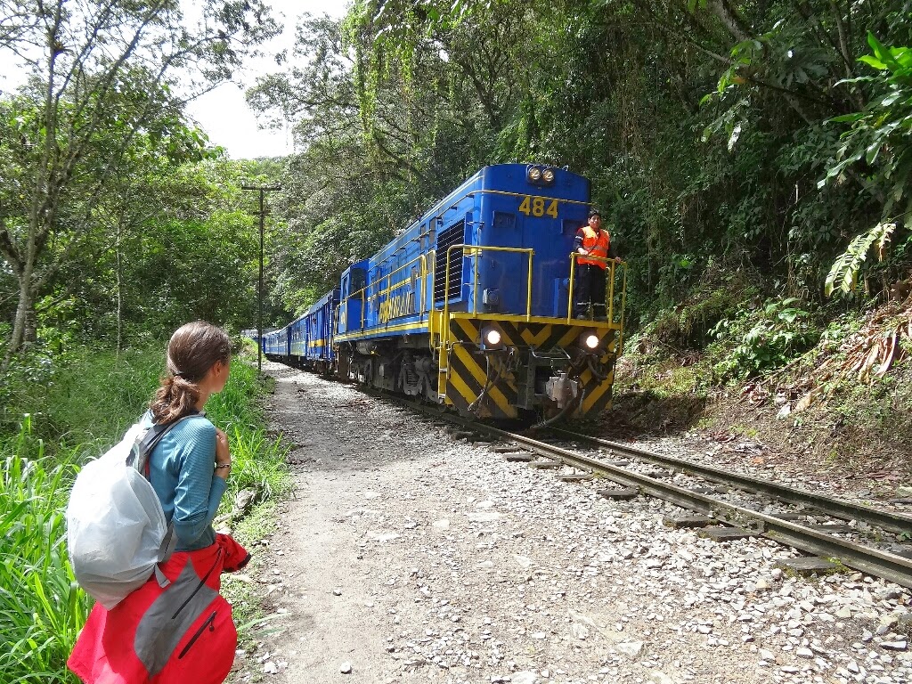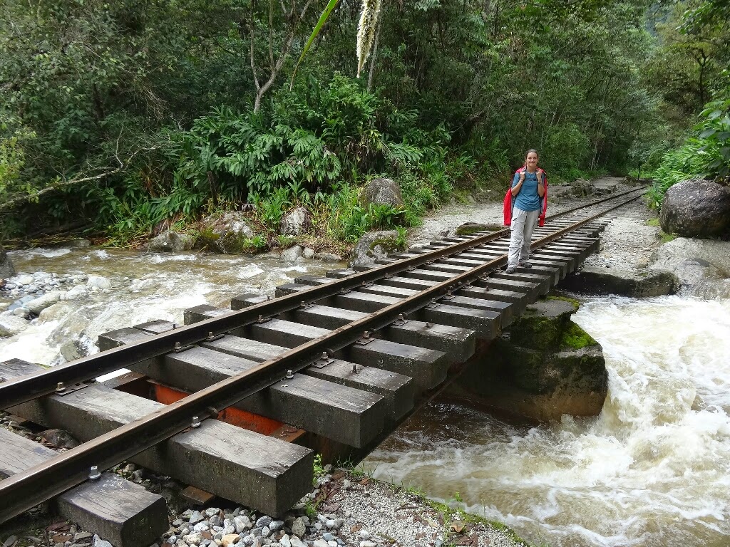 Maintenant il nous faut marcher 2h30 pour rallier Aguas Calientes, village au pied du Machu Picchu, en suivant une voie ferrée. Nous grimpons d'abord un peu dans une plantation de bananiers jusqu'à la voie principale puis nous suivons les rails. Le train passe à toute allure, on l'évite de justesse. Non, en fait on l'entend siffler et on le voit un quart d'heure après, c'est pas le TGV ! Ça crait rien.