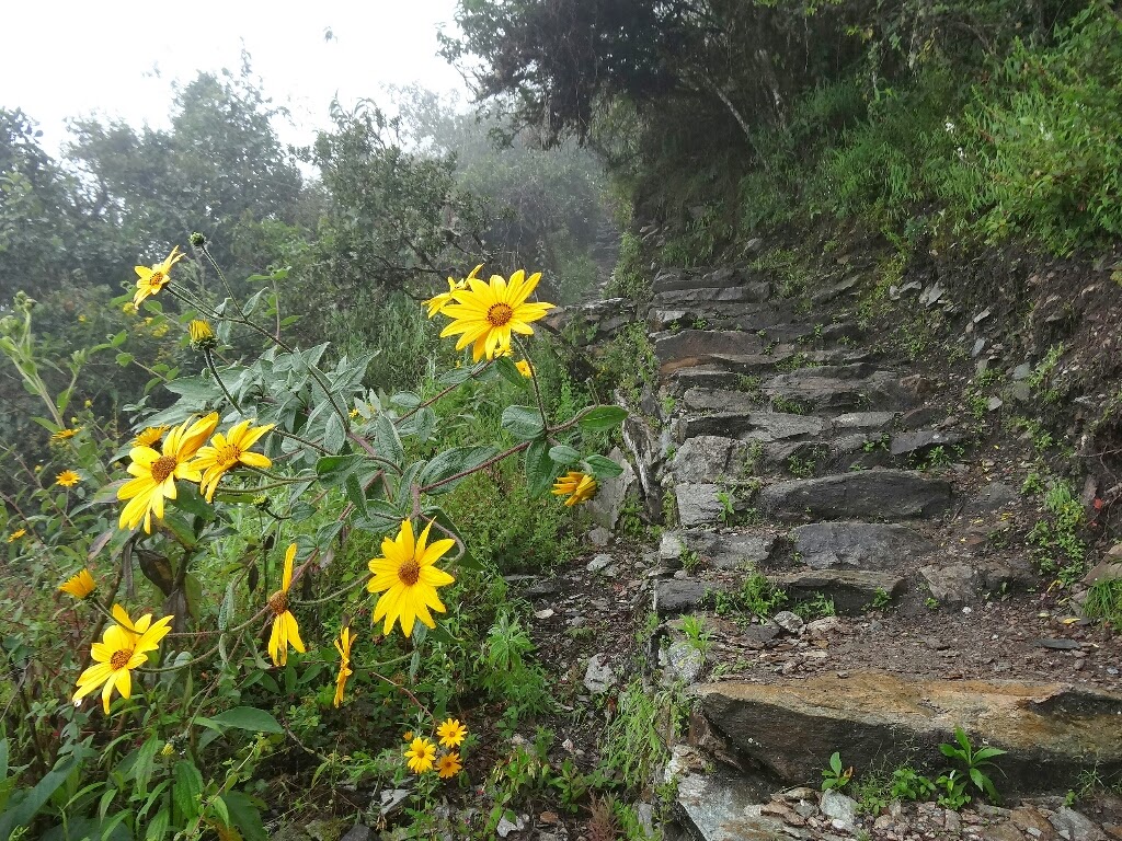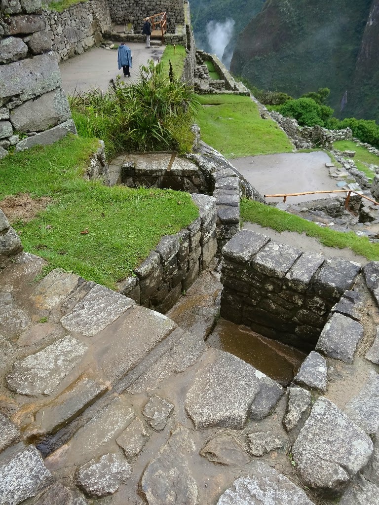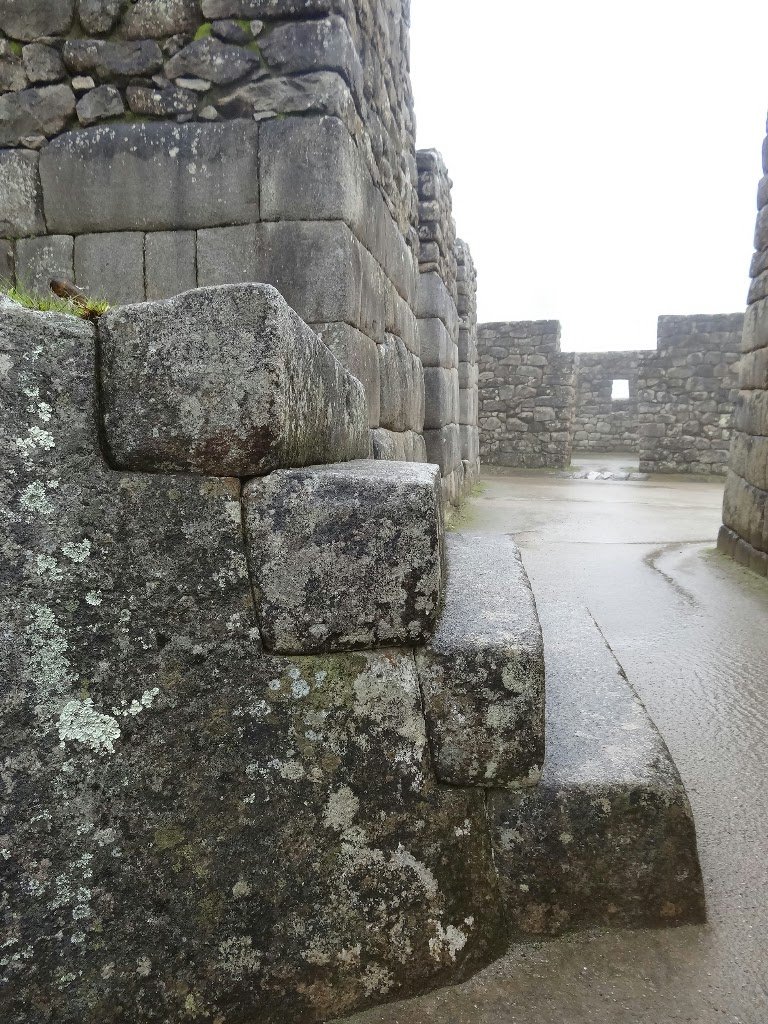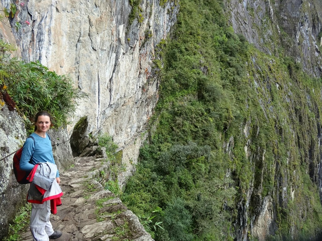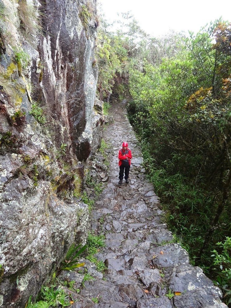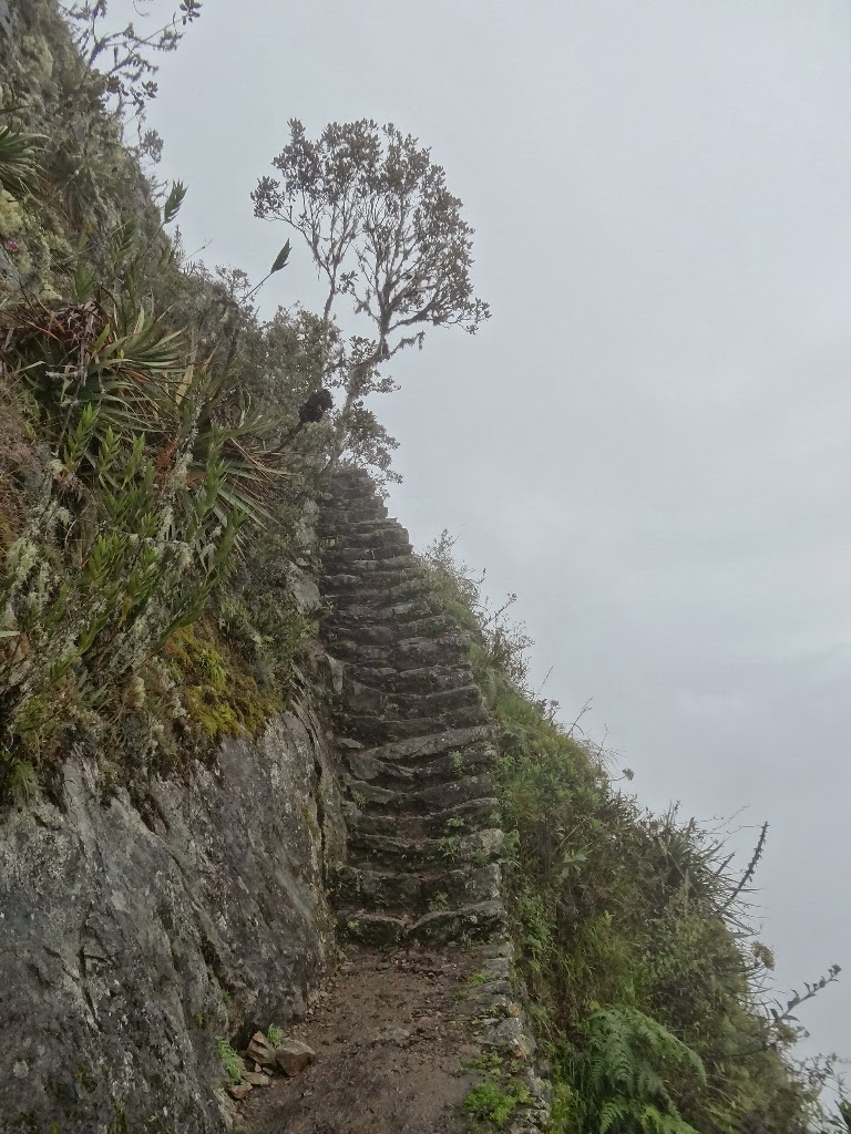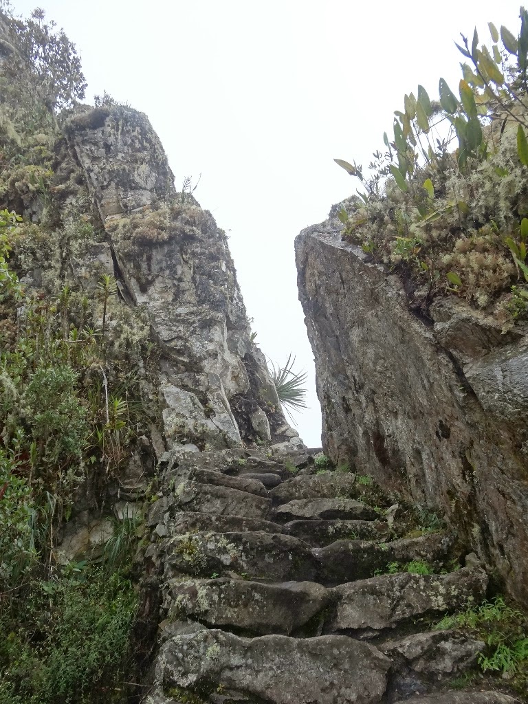 Nous avons acheté un ticket donnant accès au Cerro Machu Picchu. Il est aussi possible de gravir le Wayna Picchu mais seules 400 personnes par jours peuvent y avoir accès (contre 2500 sur le site du Machu Picchu), du coup il faut réserver à l'avance sa place, même en basse saison. L'accès au Cerro est moins limité et surtout l'ascension n'est pas facile. Encore des marches et toujours des marches, de plus en plus raides sur environ 600m de dénivelé. Nous commençons la montée sous la pluie.