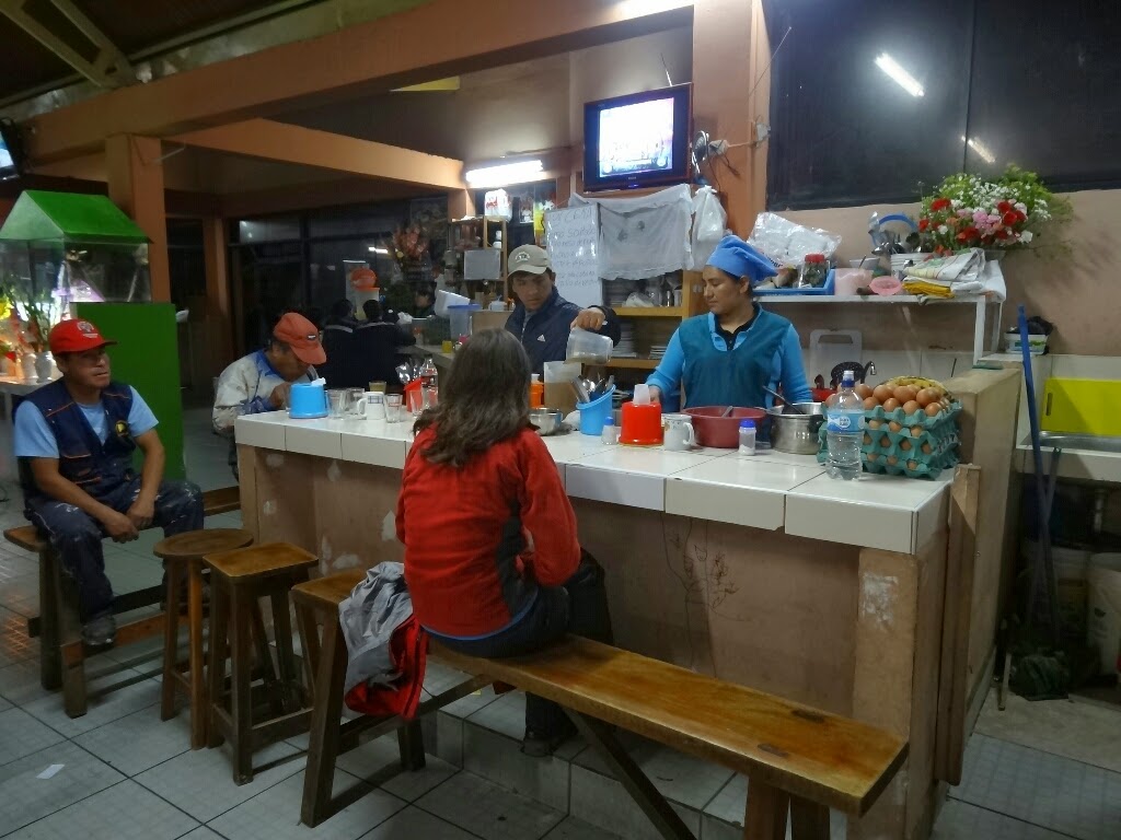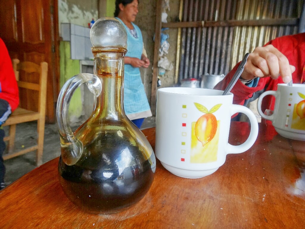 Petit arrêt pour la collation, au Pérou et en Bolivie le café très concentré se dilue avec l'eau chaude.