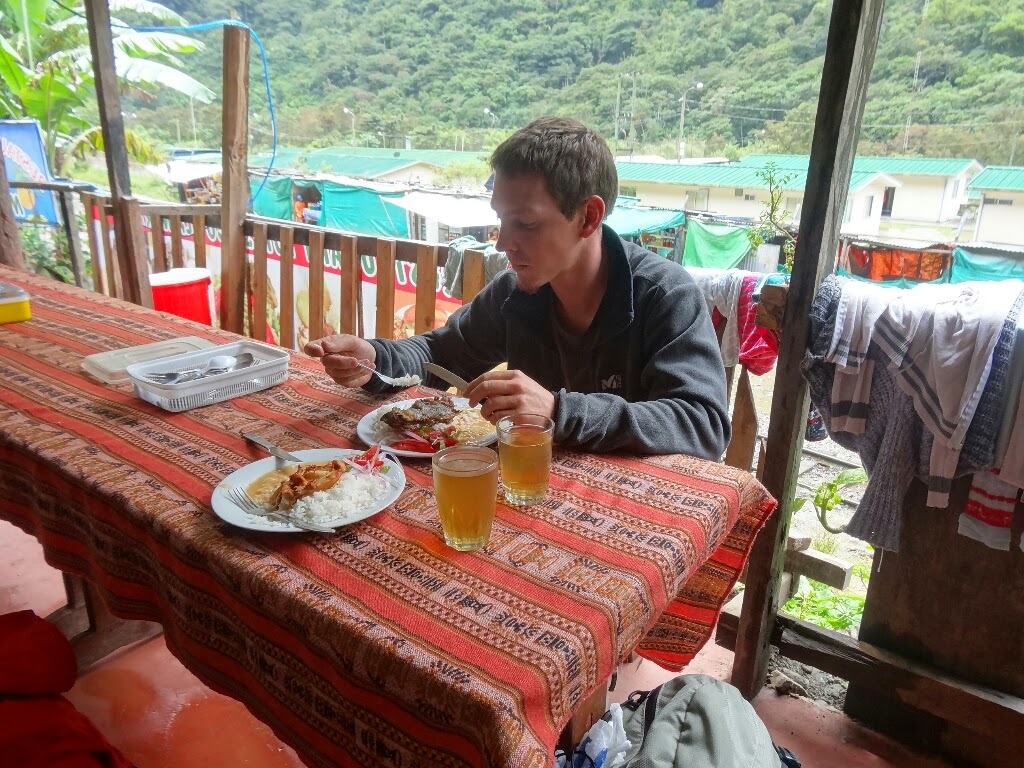 Nous quittons le site et redescendons à pieds jusqu'à Aguas Calientes. Arrivés en bas, il est prêt de 14h, on commence à avoir les crocs, direction le marché pour une bonne truite frie, du riz et des frites ! Nous passons une seconde nuit ici et le lendemain nous repartons à pied et sous le soleil jusqu'à Hydroélectrica, puis en collectivo et en mini-bus jusqu'à Ollantaytambo pour visiter la vallée sacrée (message précédent).
