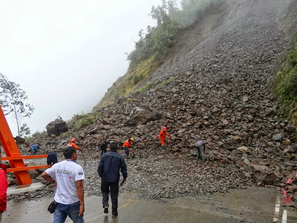 La veille un glissement s'est produit et barre la route. Des hommes la dégagent à la main en attendant qu'une pelle mécanique arrive de la vallée.