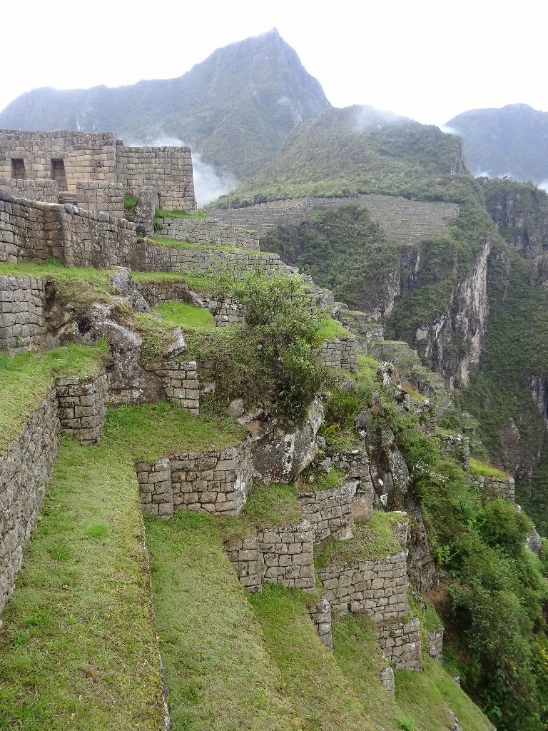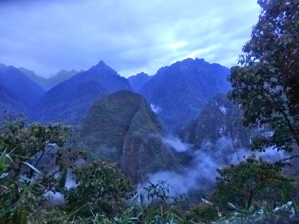 Le lendemain, on renoue avec notre vieille passion de la marche matinale nocturne, départ 4h30 du matin pour être à l'entrée du site à l'ouverture, à 6h. Nous atteignons le pont qui traverse l'Urubamba à 5h, juste au moment où il ouvre et en 45 minutes de montée raide, 600m quand même, sur un chemin en escaliers nous sommes en haut devant l'entrée. Durant la balade, le jour se lève doucement et dévoile un paysage aérien et des montagnes très raides.