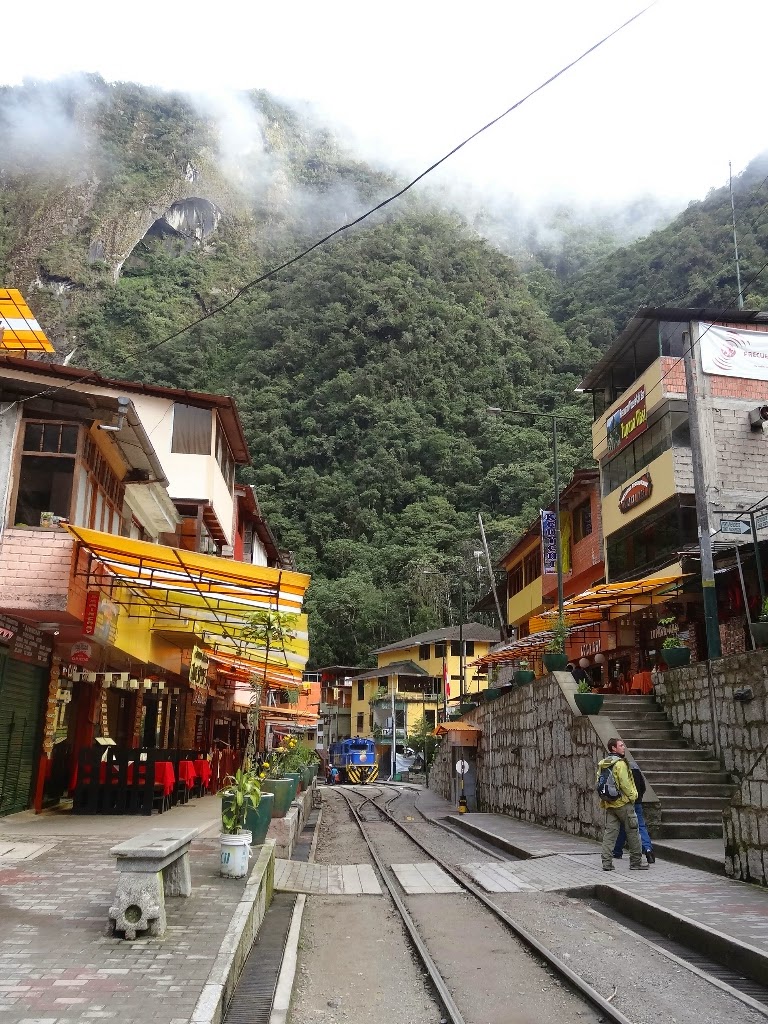 Un peu avant Aguas Calientes nous empruntons une piste qui évite de passer par deux tunnels (on est joueurs mais pas la peine de risquer de se trouver face au train en plein tunnel). A notre arrivée nous trouvons un hôtel excentré puis nous allons en ville acheter nos tickets. Cette petite ville ultra touristique n'a pas grand chose de particulier à part sa gare en plein centre ville et les prix abusément chers qu'appliquent les commerçants, surtout les restaurateurs. La solution : repas au marché matin, midi et soir, on y mange très bien, c'est local, convivial et c'est cinq fois moins cher qu'en restau touristique.
