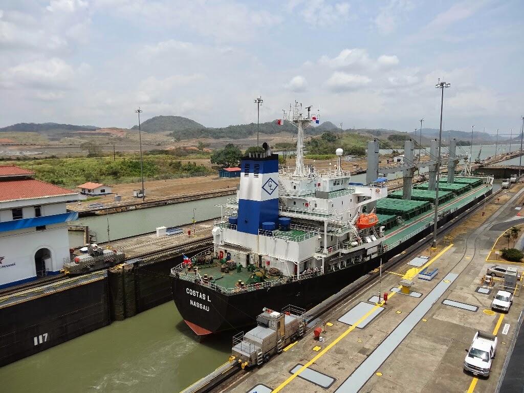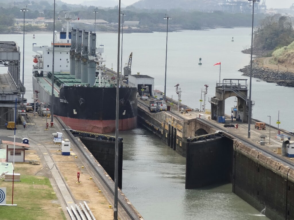Ici nous sommes côté Pacifique, les bateaux doivent d'abord passer deux écluses qui les fond s'élever d'environ 20 m. Un peu plus loin il y a une écluse de plus, les navires parcourent ensuite 80km jusqu'au grand lac artificiel de Gatun qui alimente en eau les écluses. Puis les écluses de Gatun fond redescendre les bateaux jusqu'à la mer des Caraïbes pour rejoindre l'océan Atlantique.