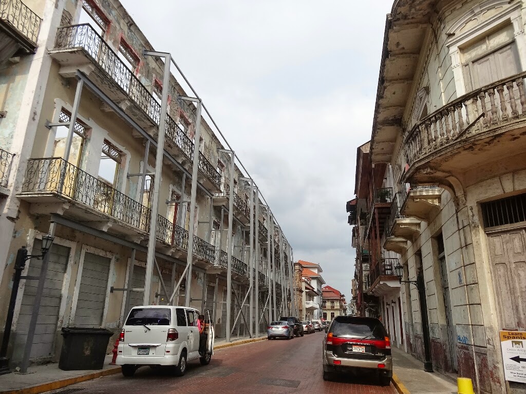Au bout d'1h30 nous arrivons dans le quartier Casco Viejo (vieux quartier de Panama city), nous posons nos sacs dans un hôtel plutôt attrayant de l'extérieur mais tout pourri à l'intérieur et pourtant c'est pas donné. Nous passons deux nuits ici, on est pas vraiment séduit par l'ambiance du quartier. Ici se côtoient de vieux immeubles rénovés abritant de grands hôtels restaurants et des bâtiments miteux occupés (ou squattés) qui tiennent tout juste debout quand il n'y a pas de structures métalliques pour les soutenir. Les gros 4x4 urbains style Porche Cayenne cohabitent avec les prostituées, les mendiants et les gars défoncés... Il y a des flics partout. Ce quartier est classé à l'Unesco depuis 2003, les travaux de rénovation sont en cours et il y a encore du boulot.