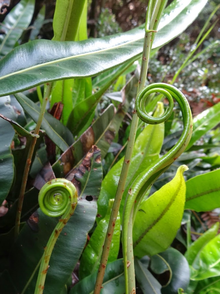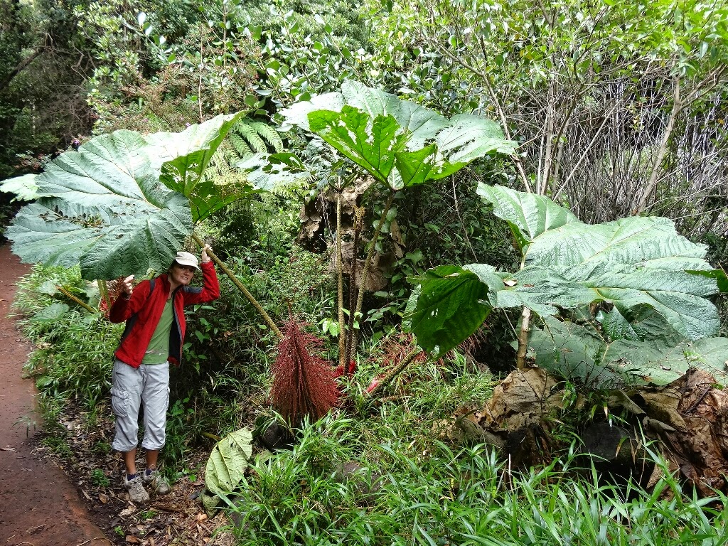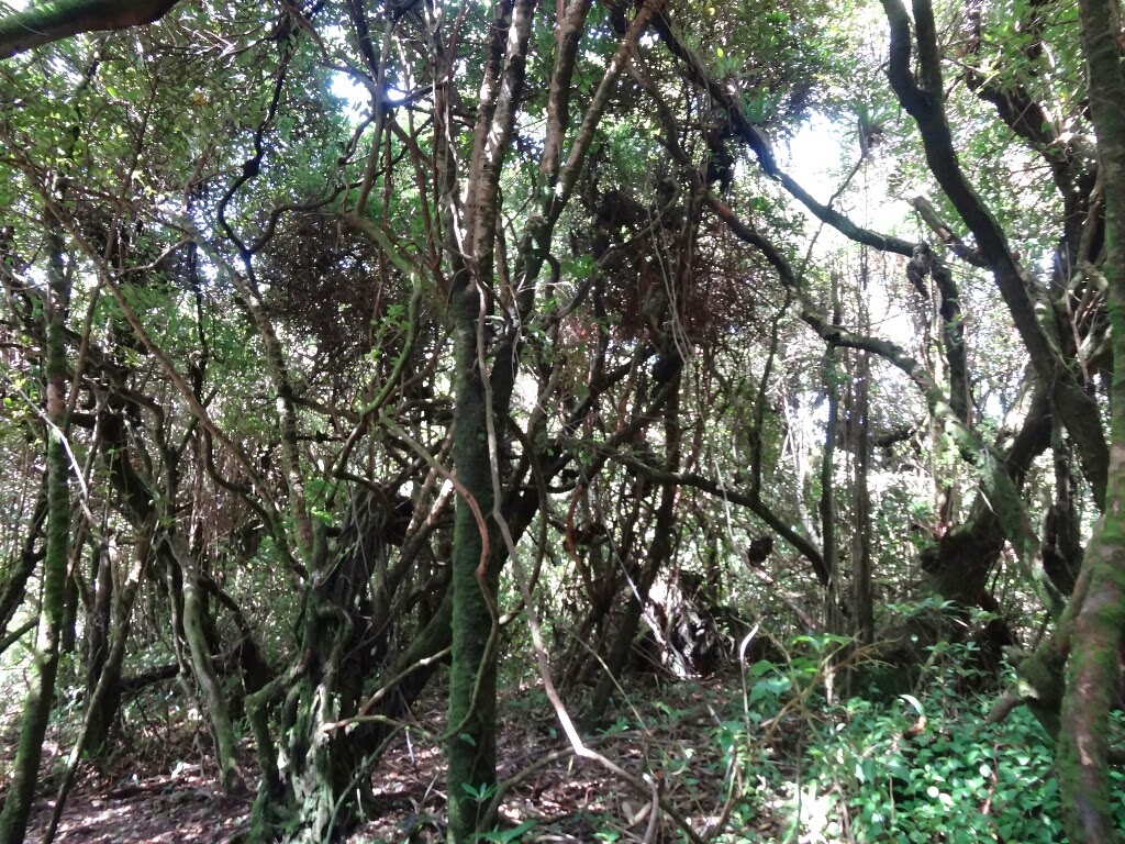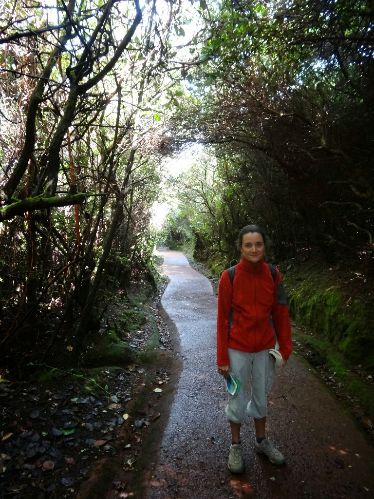 Nous marchons jusqu'à un second cratère plus ancien. Le chemin serpente dans une forêt épaisse, basse, humide et froide.