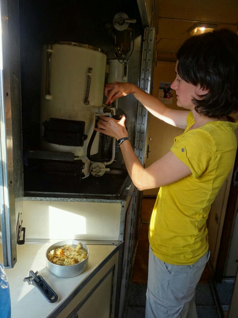 Au départ nos voisins de couchette était une grand-mère, sa fille et son petit fils de 8 ou 9 ans. Il se faisait souvent réprimandé par l'une ou par l'autre alors que nous on le trouvait très sage. Ils nous ont quittés au bout de 24h de voyage. Une mère et sa fille, apparemment très tristes de partir, les ont remplacées. Elles étaient très gentilles, ont essayé de discuter mais nous ne comprenions pas grand chose. Elles nous ont offertes des bananes et des amandes (on devait faire un peu pitié...)