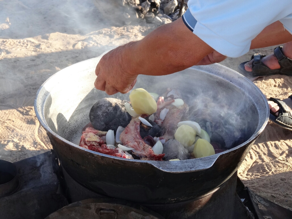 Ensuite le barbecue mongol consiste à faire chauffer des pierres puis à les mettre dans une sorte de marmite avec la viande et quelques légumes au-dessus d'un feu. La marmite est fermée et la cuisson dure une 50aine de minutes.