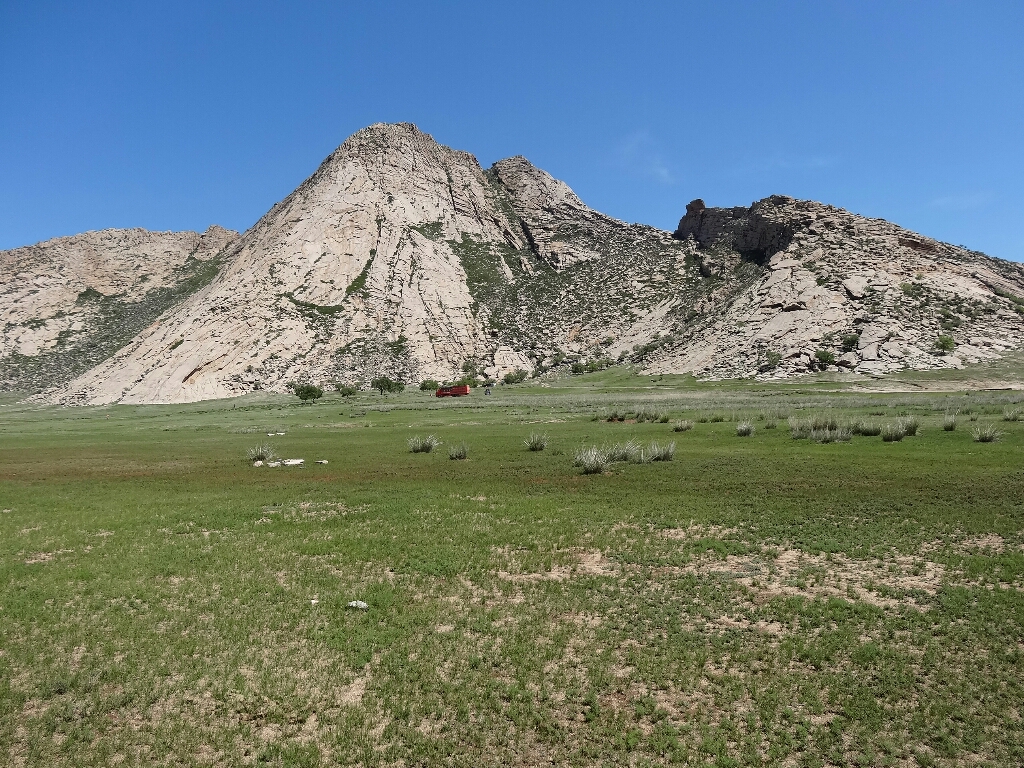 Le lendemain nous repartons en direction d'Oulan-Bator. En chemin on s'arrête au niveau de falaises gréseuses, dites "les falaises de feu", où ont été trouvés des os de dinosaures et du bois fossilisé. On a bien cherché mais on a rien trouvé, à part cet énorme os qu'on ne pouvait pas prendre avec nous.