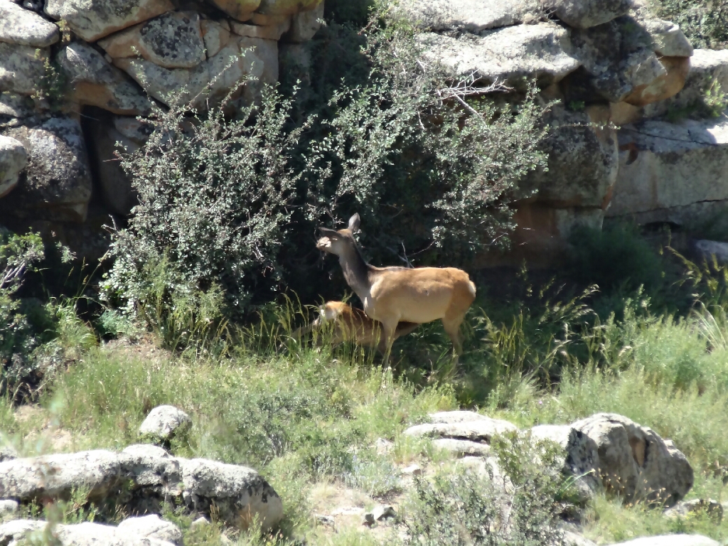 Lorsque nous arrivons sur la crête nous essayons de les repérer. Nous surprenons des biches dont une avec son petit.
