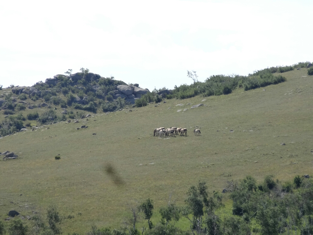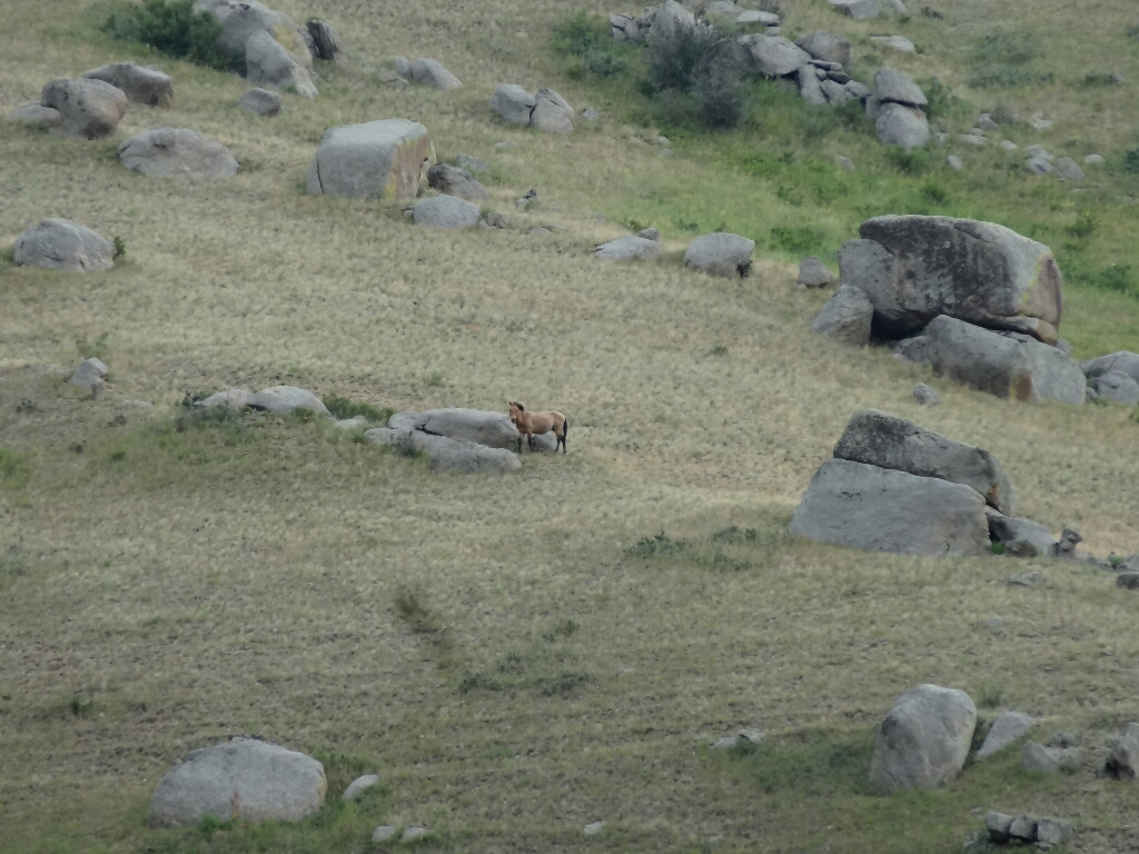 Alors que nous poursuivons notre recherche des chevaux en longeant la crête très escarpée, nous entendons un souffle de cheval. Un groupe de neuf chevaux se trouve à une 20aine de mètres en dessous de nous à l'ombre des rochers et des arbres. Nous les observons de longues minutes puis en voulant les voir sous un autre angle, ils nous sentent et s'en vont. C'était vraiment génial de les avoir vu d'aussi près.