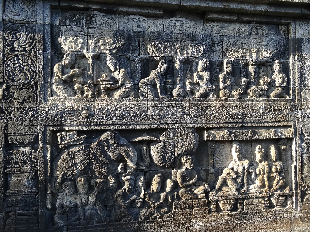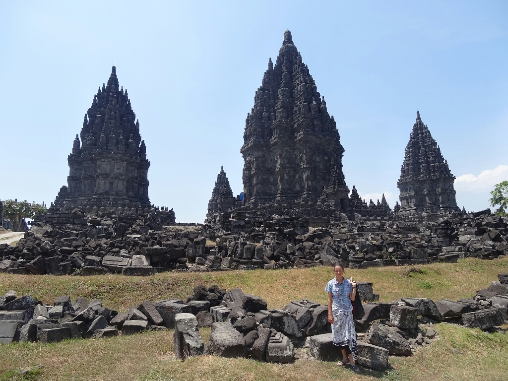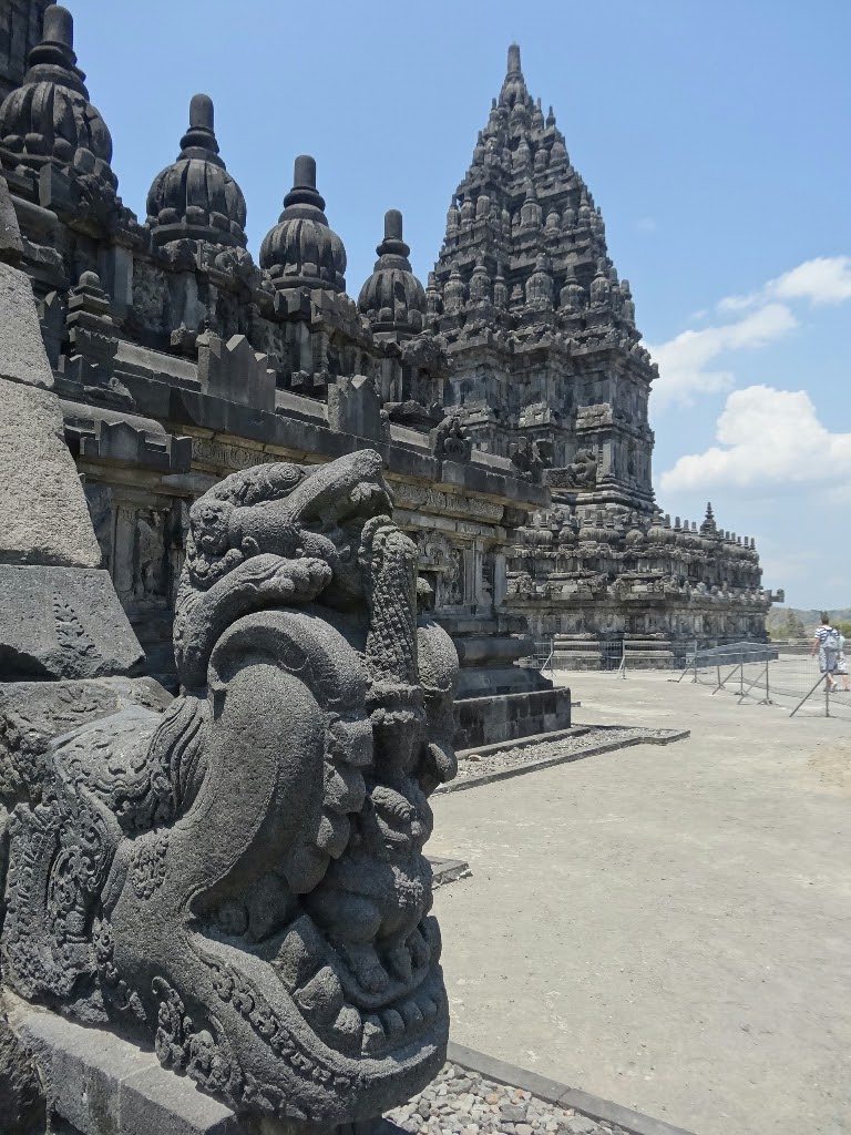 Ensuite, nous sommes allés sur le site de Prambanan. Ces temples sont les plus beaux vestiges de la période hindoue à Java. Ils furent édifiés entre les VIIIème et Xème siècles. Le site a beaucoup souffert lors du tremblement de terre de 2006, il est encore en cours de restauration. Le temple principal, Candi Shiva Mahadeva, culmine à 47 m de haut.