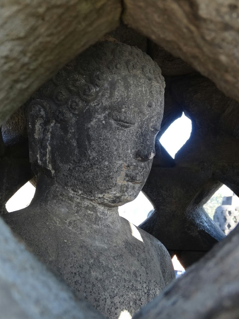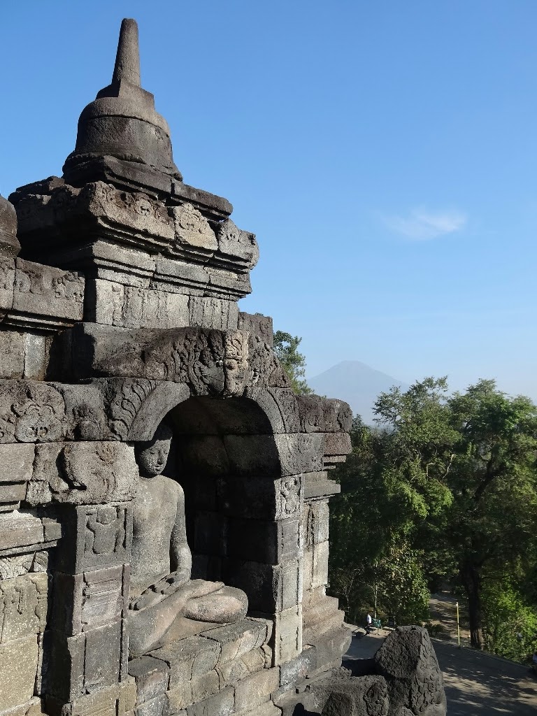 Nous arrivons à Borobudur à l'ouverture, il n'y a pas encore trop de monde et les couleurs du lever de soleil sur le temple sont très belles. Borobudur a été édifié ente 750 et 850, il est le plus gros monument boudique au monde. Au début du XXème siècle, le temple a été remis à jour, il était enterré sous des couches de cendres volcaniques. Il a fait l'objet d'importantes restaurations, il fallu stabiliser le monument qui s'affaissait car la colline sur laquelle il est construit s'était gorgée d'eau au fil des années. Il a également été remis en état suite à l'explosion de bombes posées dans le monument en 1985.