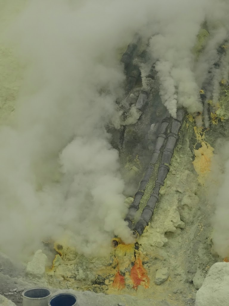 Il est normalement interdit de descendre dans le cratère, soit disant dangereux parce qu'un touriste est mort d'une chute, mais la descente n'est pas si raide. En tant que géologues, ça serait vraiment trop frustrant d'être là et de ne pas s'approcher du lac, du souffre, et de vivre les conditions de travail des gars. Nous descendons, la vue est magnifique entre le gris du volcan, le jaune du souffre et le bleu du lac. On s'approche des travailleurs qui détachent à la barre-à-mine des morceaux de souffre au pied des tuyaux qui drainent les vapeurs. On se demande comment ils font pour travailler quotidiennement dans ces conditions. De temps en temps un nuage de gaz nous envahit, les mineurs et nous, ça pique les naseaux, mais ça se dissipe rapidement. L'ambiance est un peu surréaliste.
