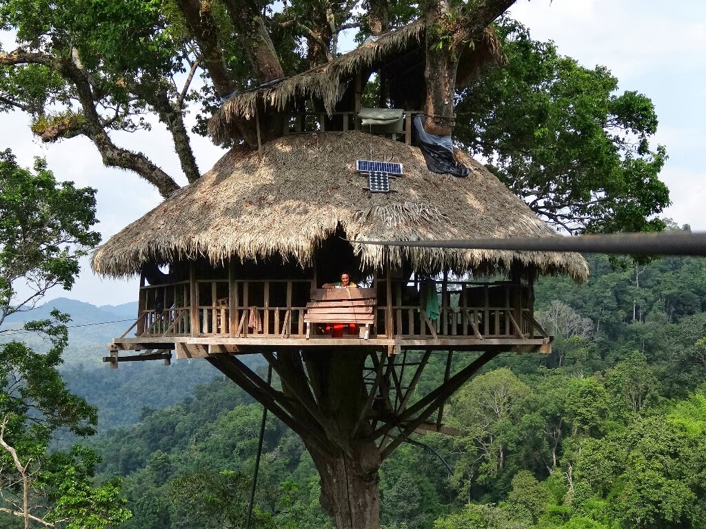 Peu de temps après nous découvrons la première cabane perchée dans un arbre à environ 40m au-dessus du sol, accessible seulement par tyrolienne, dans laquelle nous passons notre première nuit.