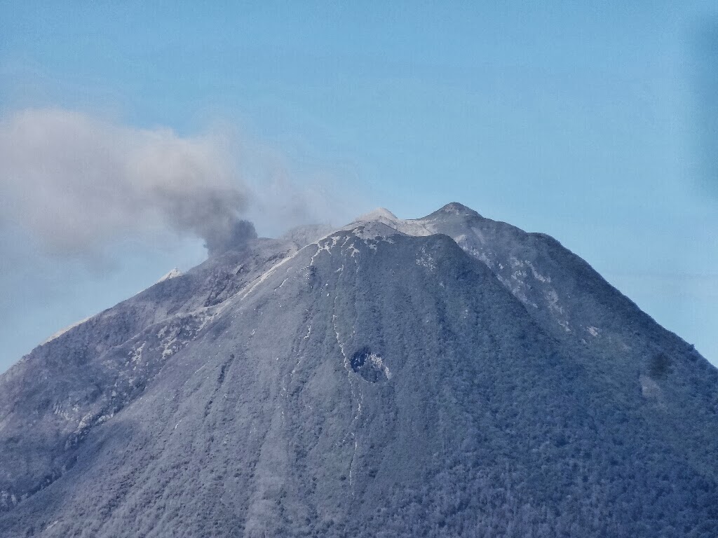Après avoir posé nos affaires, nous trouvons un point de vue sur le volcan mais le panache de cendres n'est déjà plus là. Le volcan continu d'émettre mais de façon moins violente. Finalement nous avons eut de la chance de voir le phénomène car tout c'est déroulé en moins d'une heure, le panache est monté en quelques minutes à 3km au dessus du cône, puis le vent l'a poussé vers Berastagi .