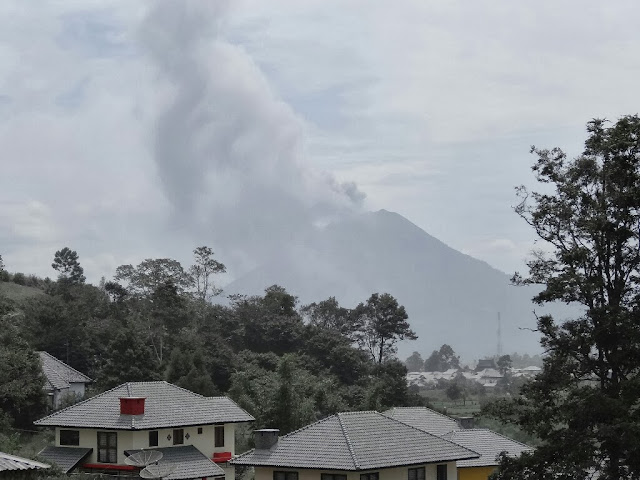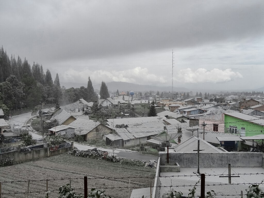 Quelques minutes plus tard nous apercevons le cône et le panache de cendres qui s'en échappe. C'est très impressionnant, mais on ne se sent pas en danger. Depuis le bus, impossible de le prendre en photo, nous l'admirons avec les yeux. Arrivés à Berastagi, nous ne voyons pas le volcan, juste le panache qui se déplace vers nous. Avant toute chose nous allons au centre d'information pour s'assurer que l'on peut rester ici. Les villages qui ont été évacués se trouvent dans un rayon de 3km du volcan. Berastagi est suffisamment loin, il n'y a pas de danger à ce que l'on reste ici. On discute quelques minutes avec la personne du centre pour une éventuelle randonnée sur le volcan voisin du Sinabung le lendemain. Au moment de sortir, il neige, des flocons de cendres très fines tombent sur la ville, nous admirons le phénomène qui dure environ 30min. Tout devient gris, et c'est dans ce décor que nous rejoignons notre hôtel.