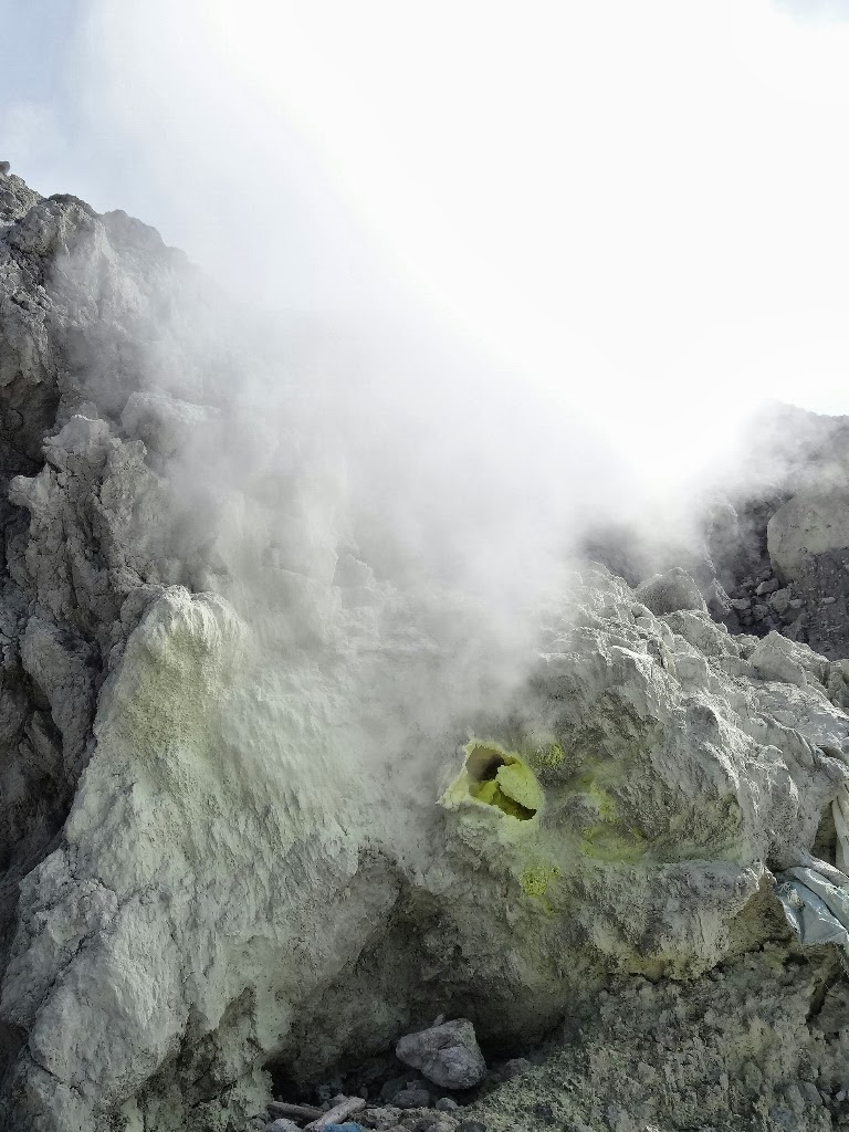 Sur le Sibayak il y a de nombreuses fumerolles qui produisent des vapeurs soufrées sur ses pentes et dans son cratère.