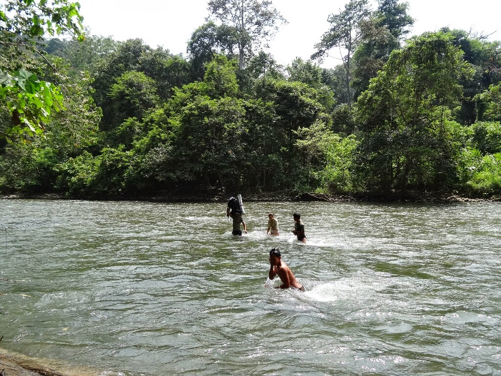 Le 25 septembre nous partons donc pour 6 jours dans la forêt avec un guide et 2 porteurs, Hatia, Sabri et Domok (allias speedy, on comprendra vite pourquoi). Première difficulté de la journée, il nous faut traverser une large rivière. On y va pas par 4 chemins, tous en slip et on traverse. Le fond est jonché de gros galets glissants, le courant est rapide et le niveau de l'eau atteint notre taille (pas de remarques désobligeantes, nous sommes au-dessus de la taille moyenne en Indonésie). Nos 3 accompagnateurs ont l'habitude et les pieds tannés, ils passent facilement même avec les sacs. Pour nous et nos pieds tendres c'est un peu plus dur et douloureux.