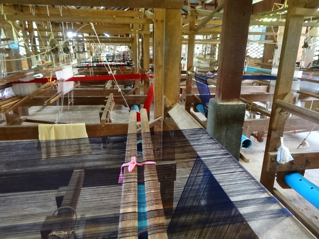 La visite se termine par le grand atelier rempli de métiers à tisser où des femmes (et un homme) tissent la soie (nous sommes dimanche, l'atelier est un peu vide). L'explication du fonctionnement d'un métiers à tisser est bien trop compliqué mais leur travail est vraiment impressionnant.