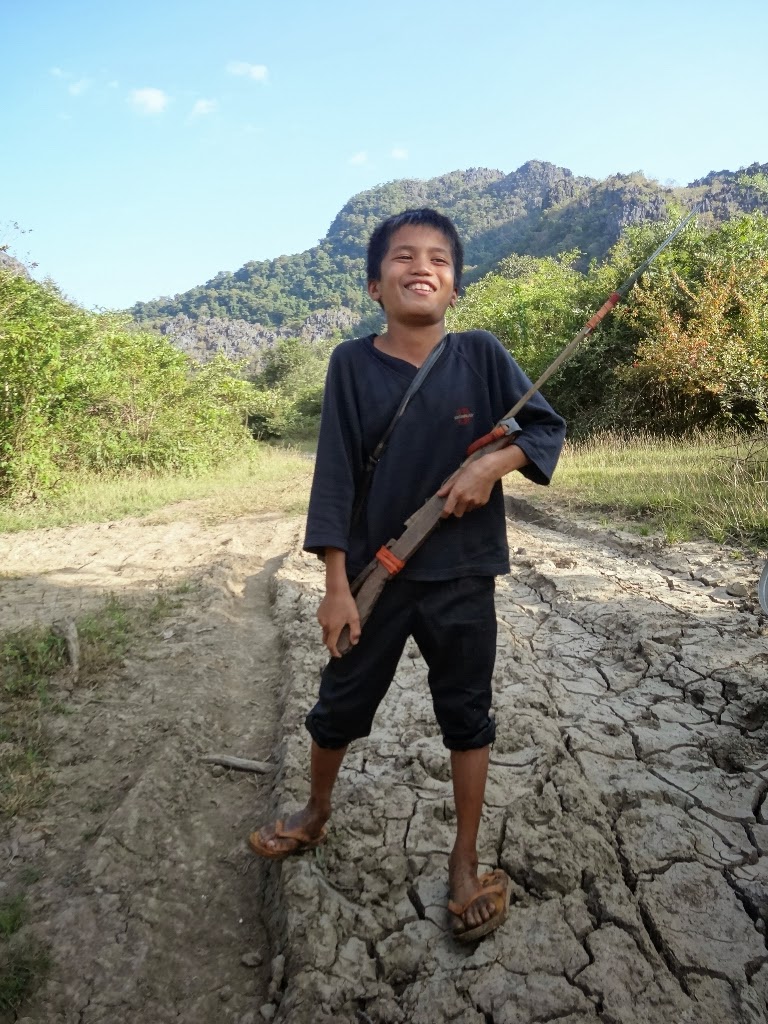 Sur le chemin qui mène au village étape du trek, nous croisons une bande d'enfants qui revient d'un pique-nique. Les filles se font belles pour la photo et le garçon qui fait son malin avec son harpon devient d'un coup plus timide quand on lui demande de poser seul pour une photo. Nos routes se séparent un peu plus loin.
