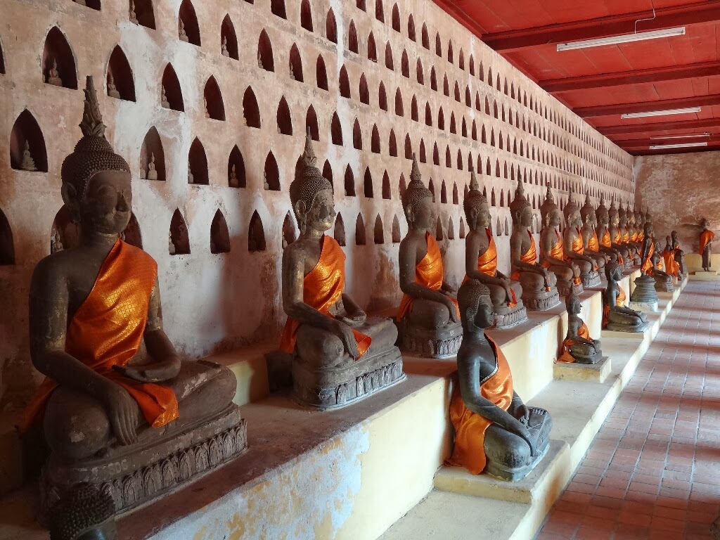 Nous faisons un premier arrêt au Vat Si Saket, les murs intérieurs du cloître sont criblés de niches garnies de petits bouddhas et des étagères supportent aussi des bouddhas de toutes sortes : assis, debout, en bronze, en bois ou en plâtre. Dans le temple lui même, les murs sont également garnis de bouddhas et l'autel en supporte plusieurs. Il y aurait au total quelques 6400 statues de bouddhas dans ce temple.
