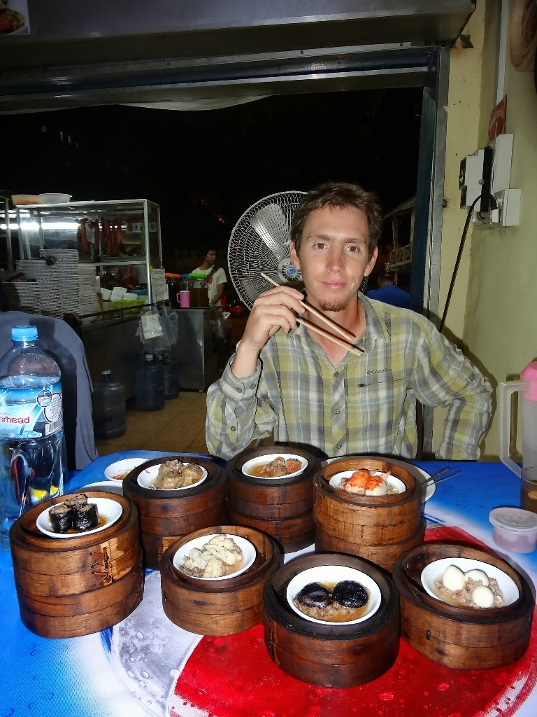 Le soir nous mangeons dans un restaurant où sont préparées des petites bouchées, cuites à la vapeur dans des récipients en bambou, de crevettes, oeufs de cailles, pâtes fourrées, champignons farcis, ... c'est super bon.