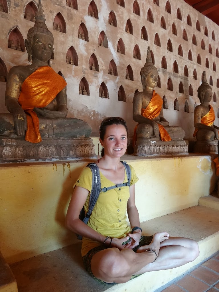 De retour à Vientiane nous visitons le site de Pha That Luang. Ce monument symbolise à la fois la religion bouddhique et la souveraineté laotienne. En son centre se trouve un stupa doré et au nord et au sud se trouve deux temples et un énorme bouddha couché.