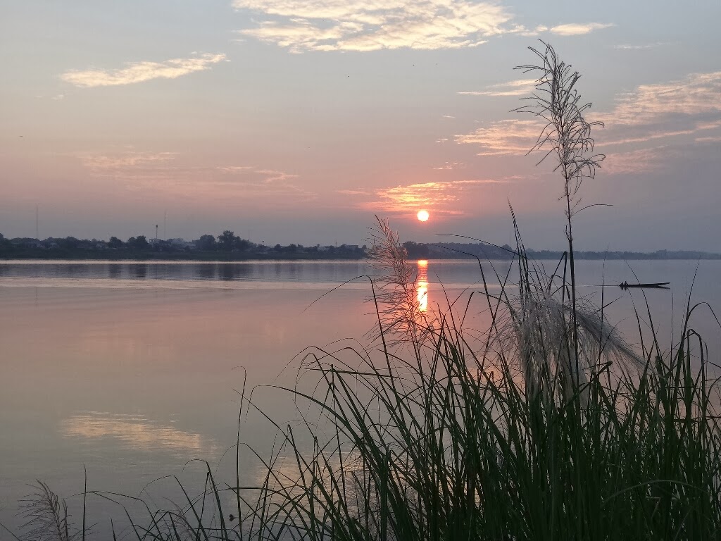 Puis nous gagnons les berges du Mékong pour admirer le coucher de soleil. De l'autre côté c'est la Thaïlande. Une femme pêche des petits poissons avec la méthode dite de la pêche au carré.