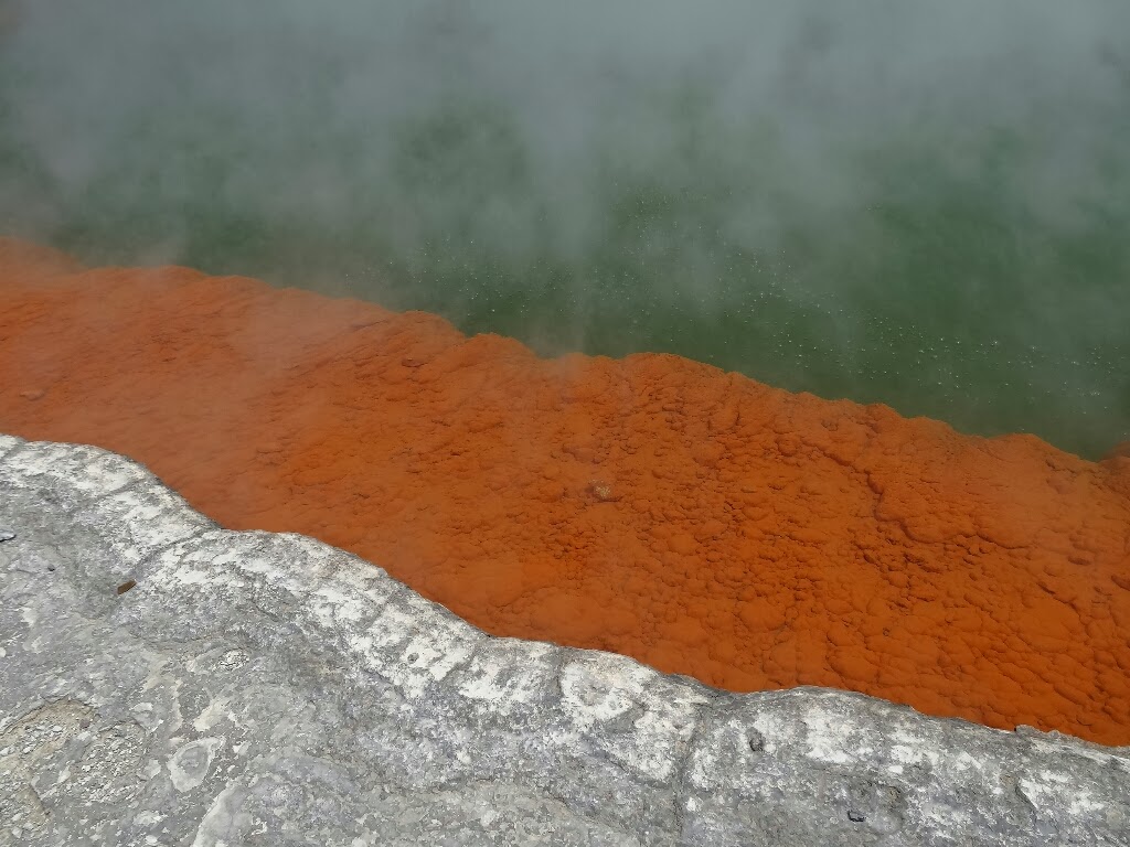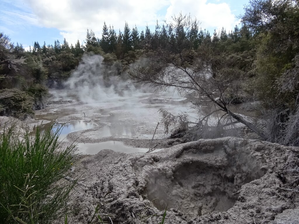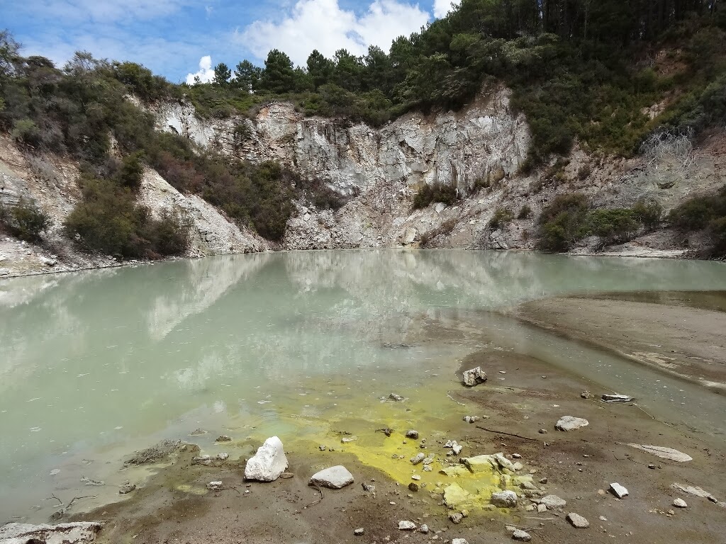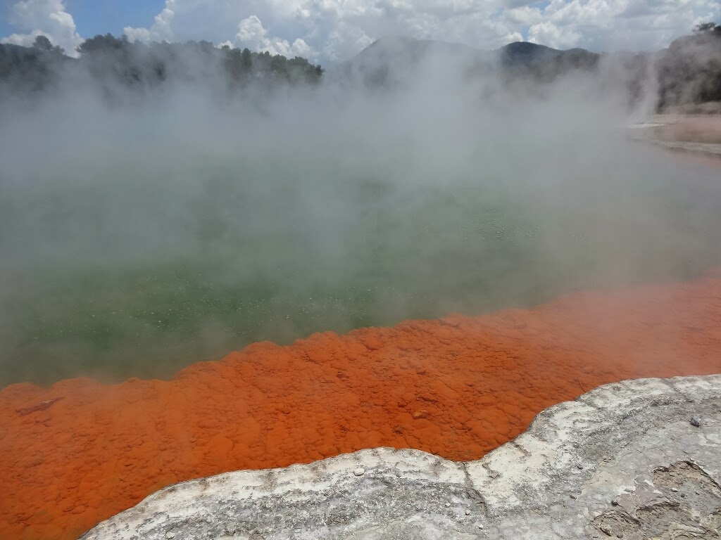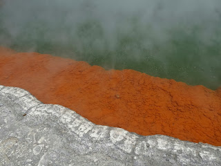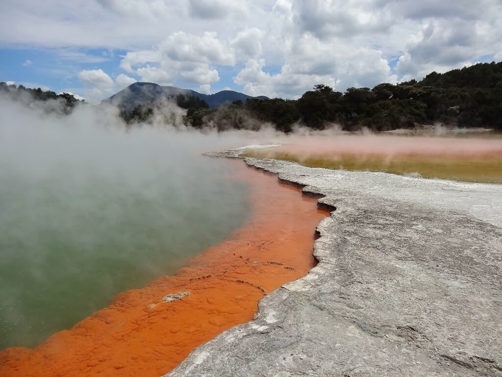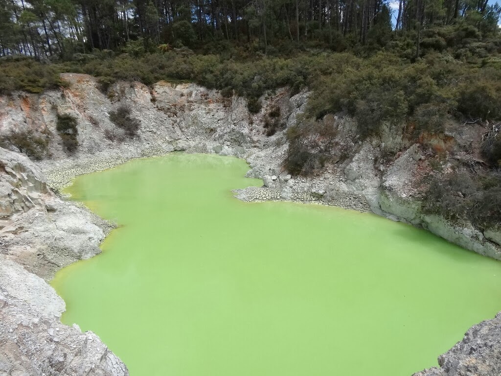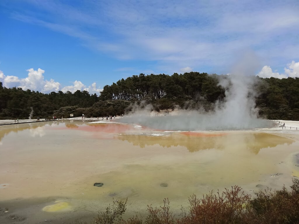 Le lendemain nous allons sur le site volcanique et thermal de Wai-O-Tapu (qui signifie "eaux sacrées" en maorie). Ce site est une réserve naturelle de la région volcanique de Taupo. On peut y voir des cratères creusés par l'action acide des eaux souterraines, des piscines de boue bouillonnante et des eaux de toutes les couleurs. Ce site est vraiment superbe de par la diversité des phénomènes thermaux que l'on peut y observer.