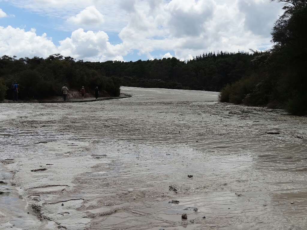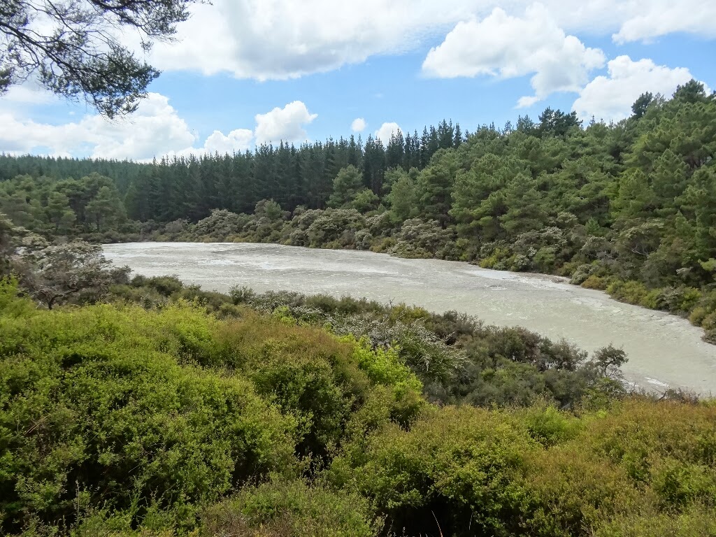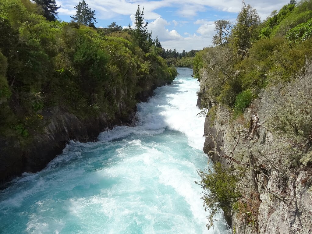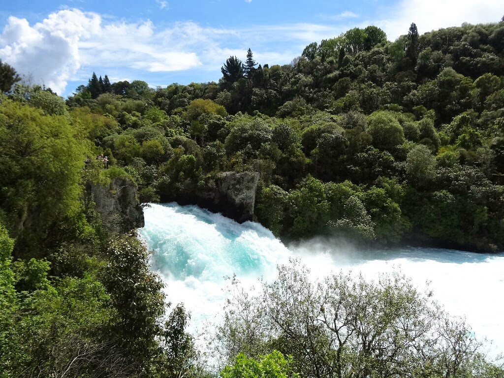 Nous repartons ensuite en direction du lac Taupo. En route nous faisons un arrêt à Huka Falls. La rivière qui sort du lac Taupo fait 100m de large puis soudain elle doit se frayer un chemin dans une gorge de 15m de large et chuter d'une vingtaine de mètres. Le débit est de 220 000 litres par secondes. Les photos ne rendent pas l'effet bouillonnant de ce torrent mais c'est assez impressionnant. Cherchez Boris et Patrick sur la photo. Certains l'on descendu en kayak, on se demande comment ils sont arrivés en bas.