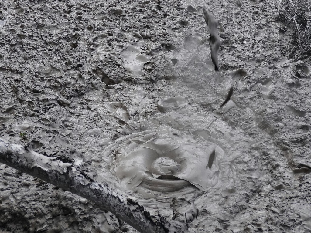 Le long des chemins aménagés sur le site nous croisons d'abord des cratères au fond desquels de la boue bouillonne.