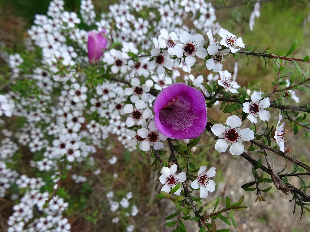 En chemin nous croisons des manukas en fleurs (et des digitales). Le miel produit, exclusivement en Nouvelle-Zélande, à partir de ces fleurs est très réputé pour ses propriétés médicinales.