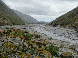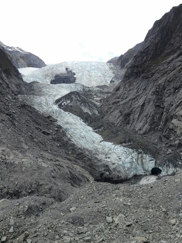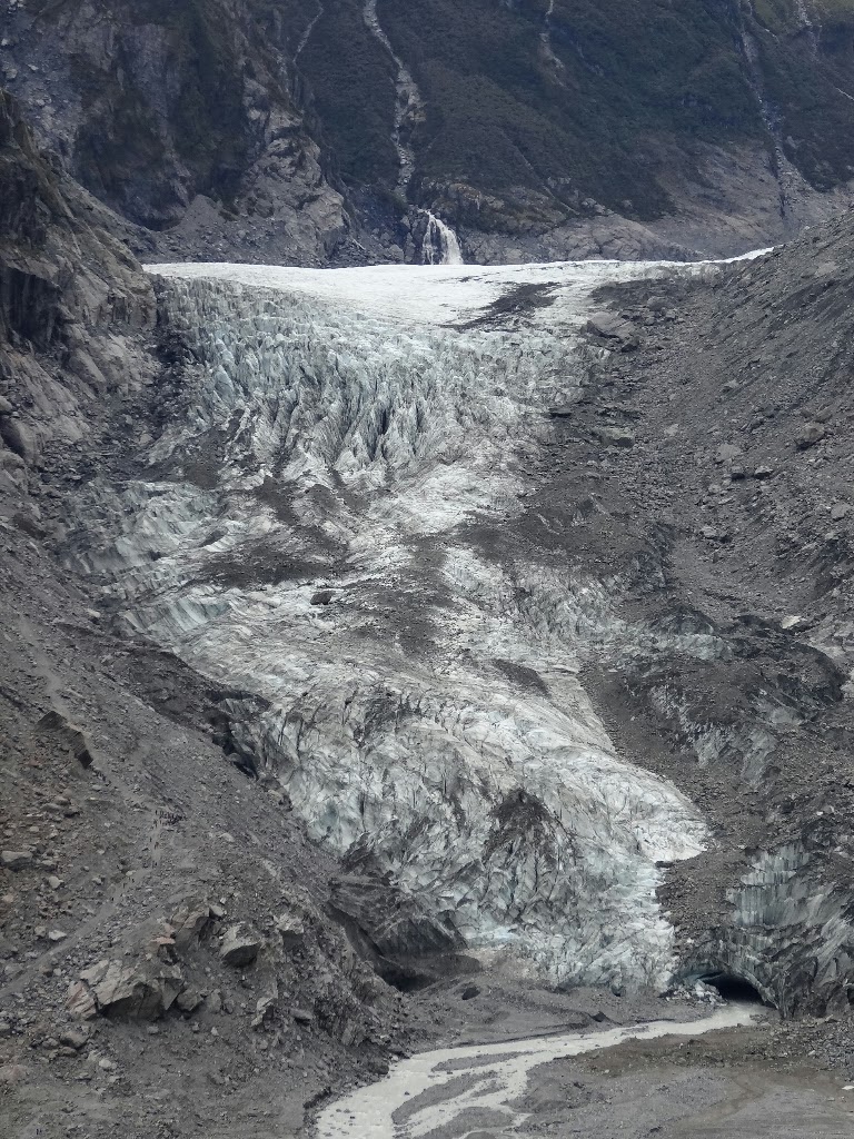 Nous partons ensuite pour le glacier Franz Joseph. Nous l'apercevons d'abord de loin puis nous nous en approchons à pieds. Ce glacier a beaucoup reculé depuis 2008, il arrivait alors jusqu'à la moraine à droite.