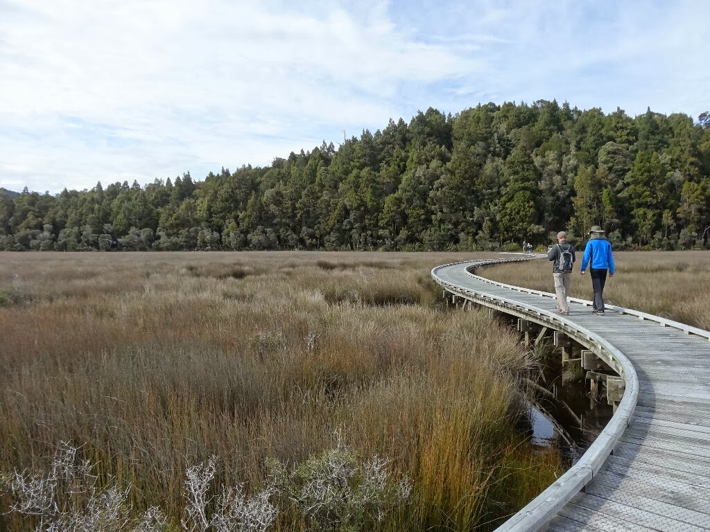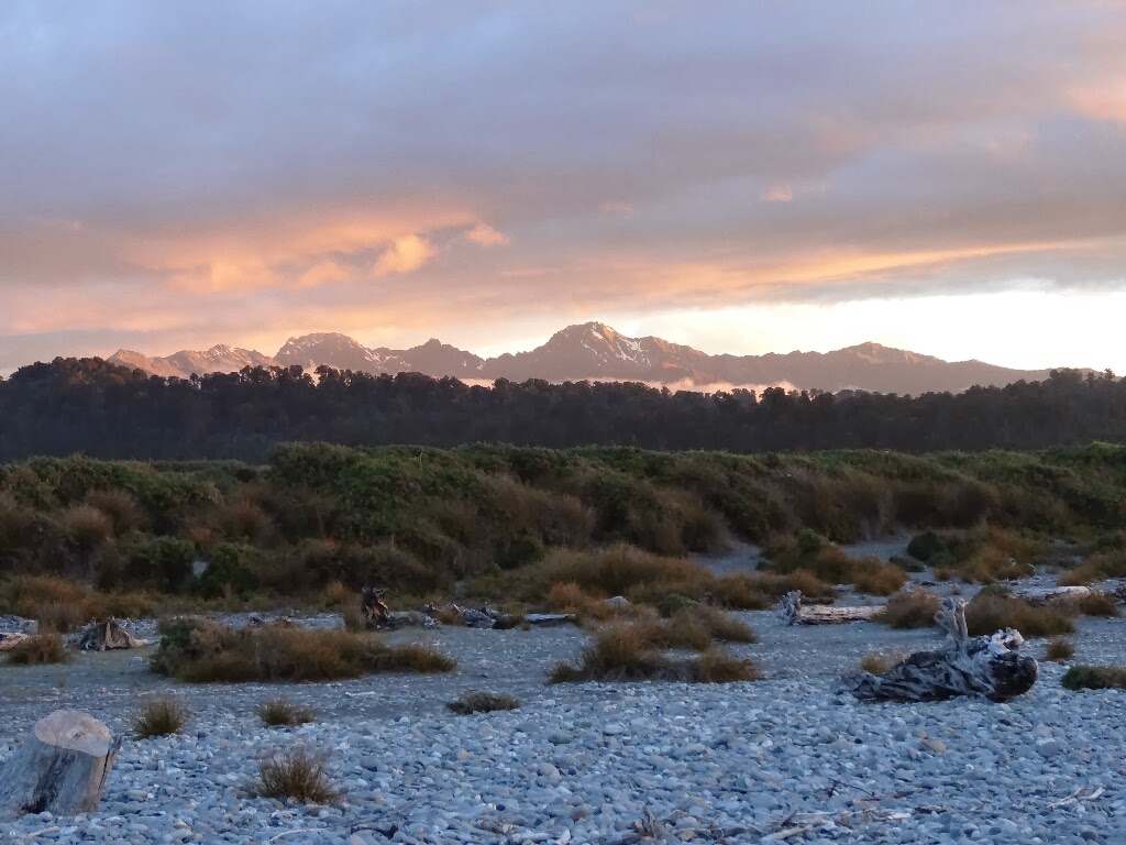 Au petit matin le ciel est clair même s'il y a encore quelques nuages. Depuis Okarito nous empruntons un chemin qui nous mène à un point de vue sur la chaine des Alpes.