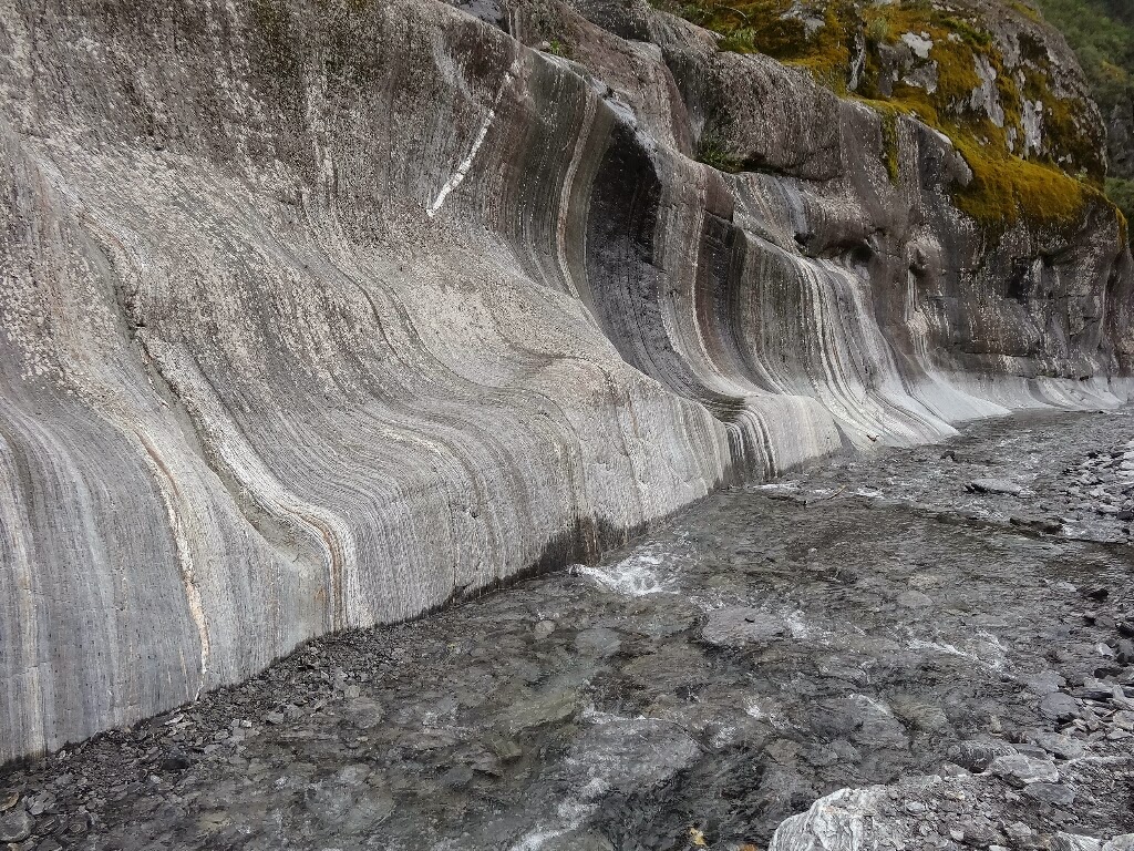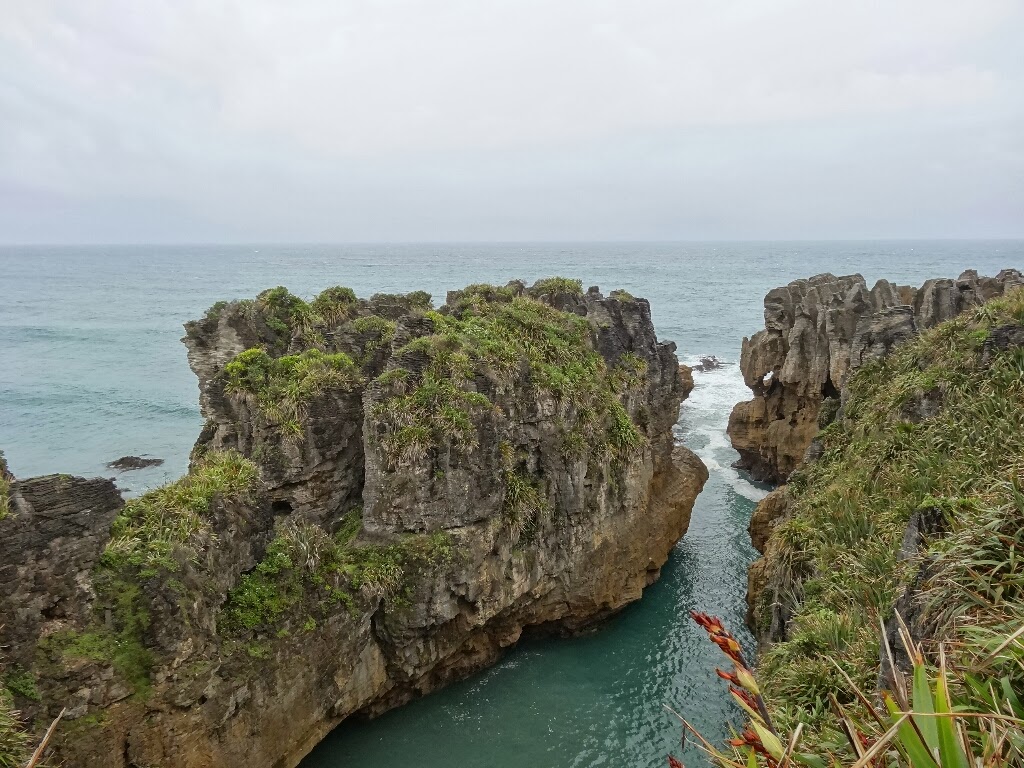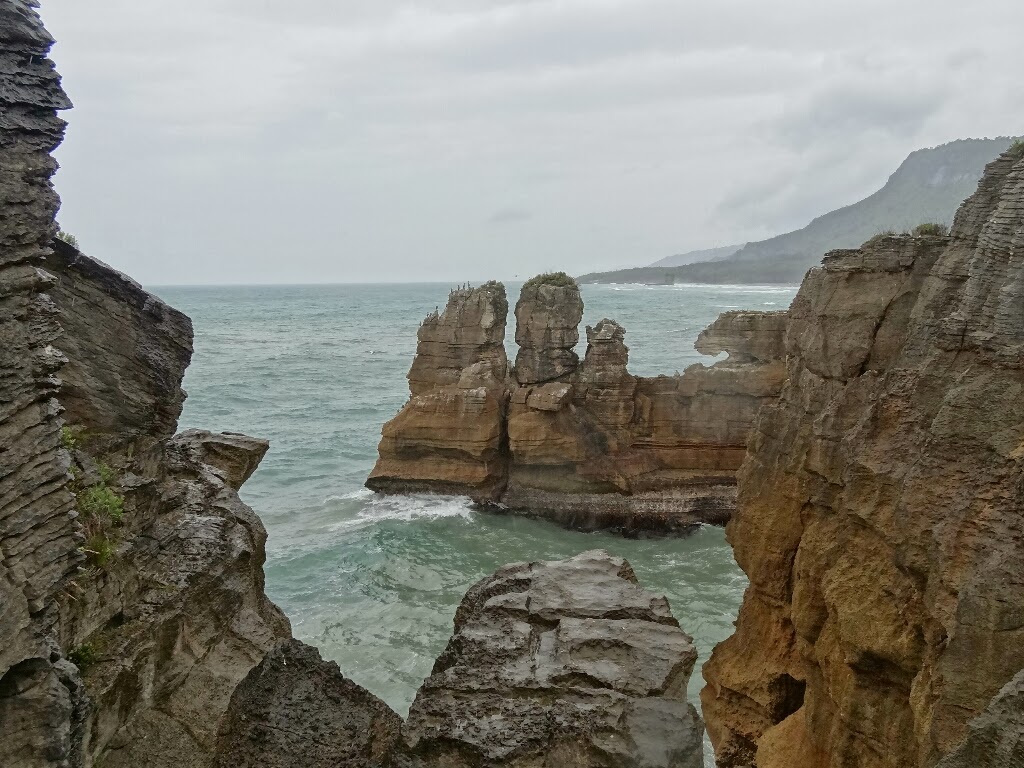 Un peu plus au Sud on s'arrête à Punakaiki pour faire la balade de "Panecake Rocks", formation géologique particulière fouettée par les vagues. De là à y voir un empilement de panecakes, ils faut être anglais et peut-être avoir forcé sur la bière.
